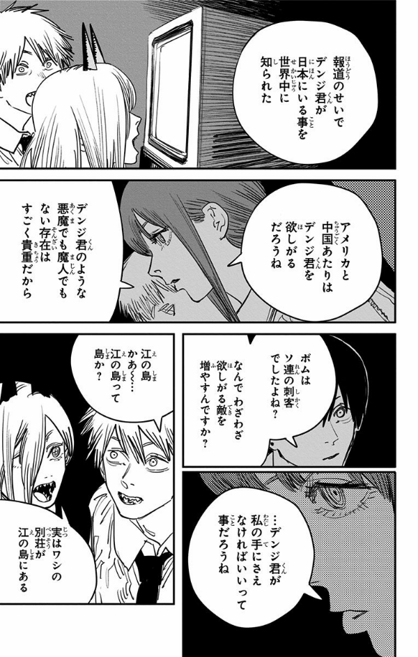 その姿が「恐怖!! デンノコ悪魔!!」としてTVで報道され、全世界に存在が知られることとなったデンジ!! イカれた凄腕の刺客達が、各国から東京に集結する中特異課は戦力を総動員し、デンジ防衛作戦を敷くが!? ルール無用で襲い殺し合う、地獄のカオスが渦を巻く!!