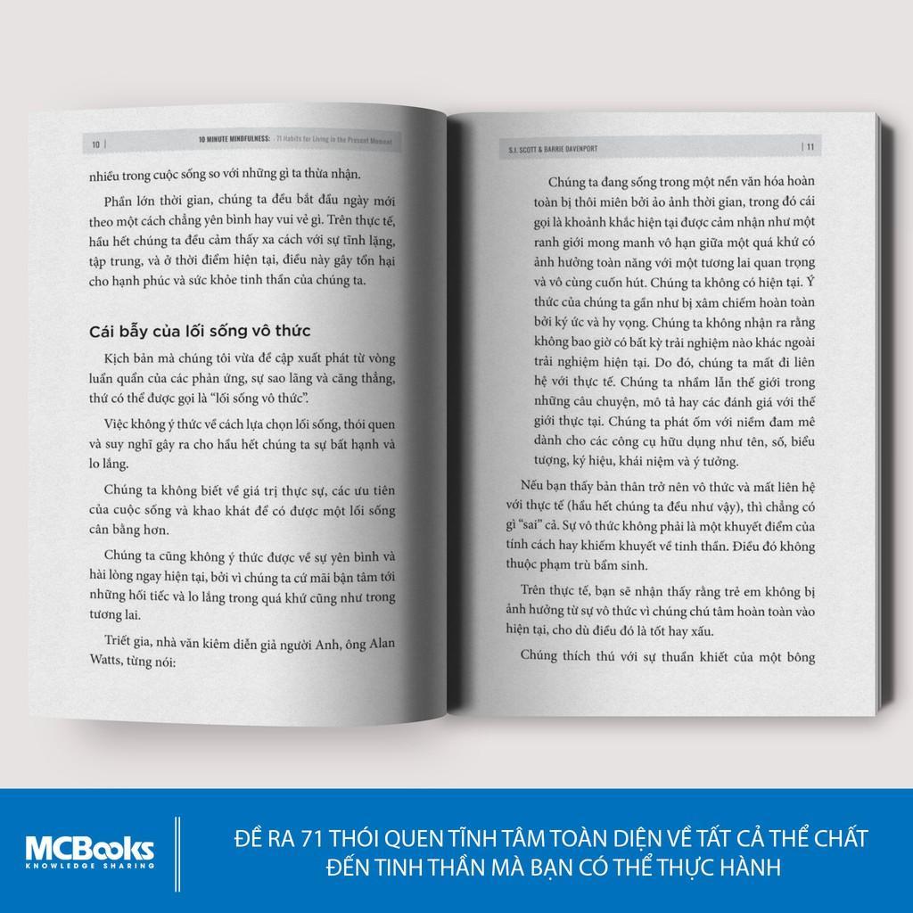 - Cuốn sách "10 phút tĩnh tâm" sẽ đưa ra 71 thói quen tĩnh tâm giúp bạn quên đi những mối phiền nhiễu, sống tốt hơn ở hiện tại