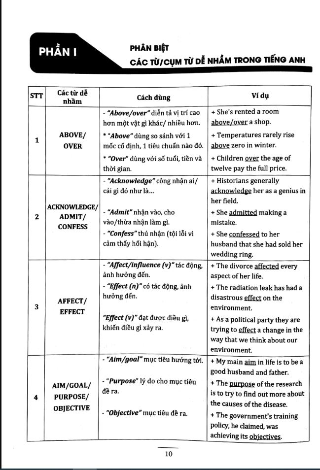 Phần 1: Những từ dễ gây nhầm lẫn. Ở phần này có hệ thống lại những từ đồng nghĩa, đồng âm và phân biệt sự khác nhau trong ý nghĩa cũng như cách dùng của các từ đó. Bên cạnh những ví dụ minh hoạ cho từng phần giải thích còn có bài tập áp dụng để giúp người học áp dụng, luyện tập để nắm vững kiến thức một cách tốt nhất và hiệu quả nhất.