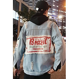 - Áo khoác jeans nam vá rách in chữ Brazil với chất liệu jeans thô mềm mại giúp bạn thoải mái vận động, thích hợp mặc khoác ngoài giúp tránh nắng, giữ ấm mà vẫn hợp thời trang và phong cách.