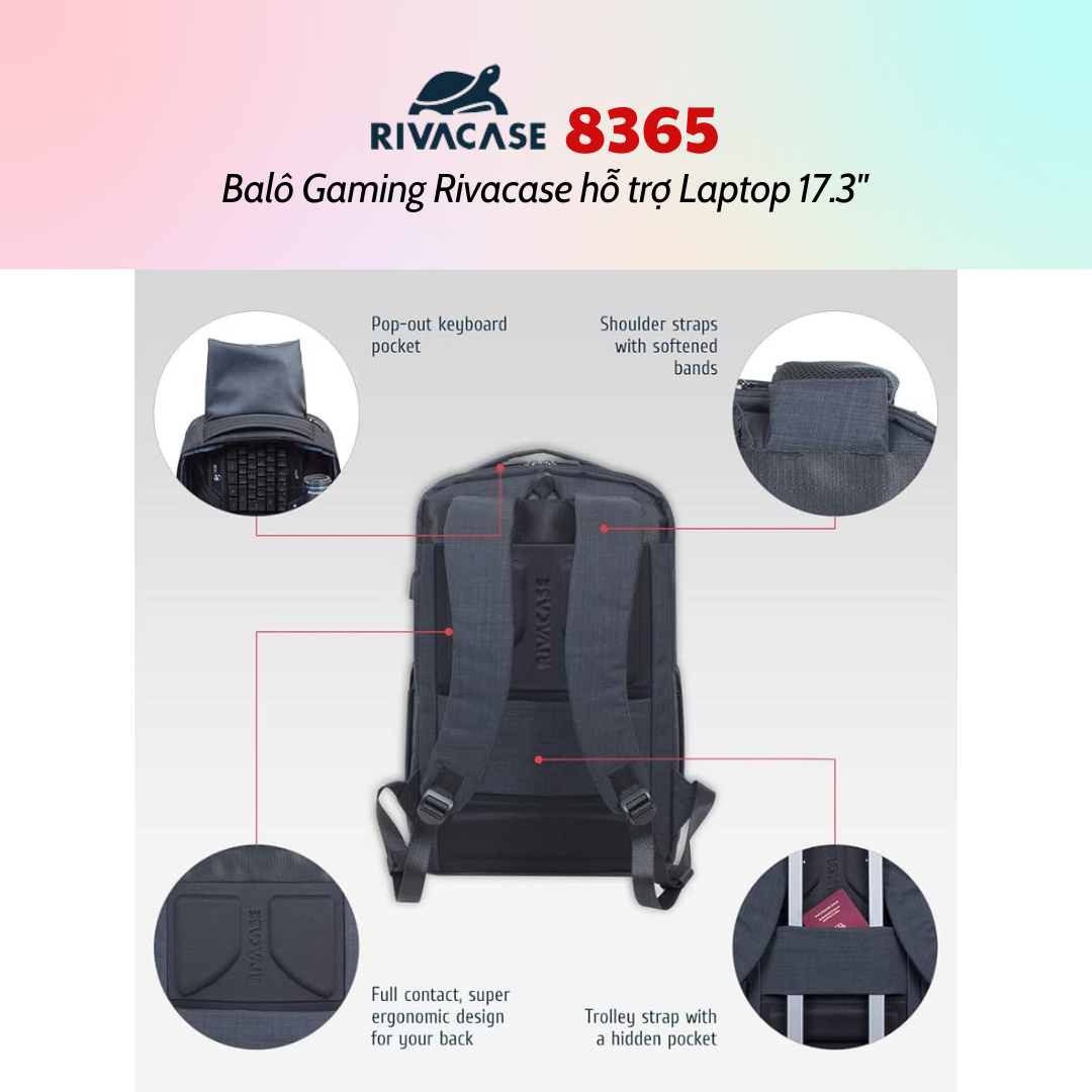 Rivacase 8365 được chú trọng từng chi tiết và đi kèm với một loạt các tính năng mang đến cho người dùng sự thoải mái và tiện lợi. Mặt bên ba lô được trang bị cổng USB dùng để cắm sạc pin các thiết bị di động trong khi di chuyển. Tay cầm, dây đeo vai êm, mềm mại, tạo cảm giác thoải mái cho người dùng trong suốt quá trình đeo và sử dụng. Thêm vào đó, mặt sau ba lô được thiết kế tiện dụng mang lại sự thông thoáng dễ chịu cùng với dây đeo hành lý xe đẩy giúp người dùng dễ dàng di chuyển.