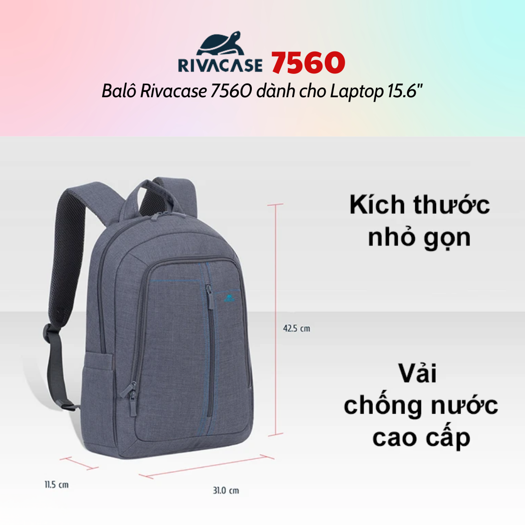 THÔNG TIN SẢN PHẨM Ba lô Rivacase 7560 dành cho Laptop 15.6" - Ba lô có trọng lượng nhẹ dành cho máy tính xách tay hỗ trợ kích thước màn hình 15.6" - Chất liệu cao cấp Polyester, chống nước - Màu sắc: Đen (Black), Xanh (Blue), Xám (Grey), Đỏ (Red) *Thông tin kĩ thuật: Thương hiệu: RIVACASE Tên sản phẩm: 7560 Laptop Canvas Backpack 15.6" black Mã sản phẩm: RIVACASE 7560 Kích thước nội ngoại: 295x380x45 / 310x425x115 Trọng lượng: 435 g Chất liệu: Polyester Màu sắc: Đen (Black), Xanh (blue), Xám (grey), Đỏ (red) Bảo hành từ nhà sản xuất : 24 tháng *Tính năng sản phẩm: • Ba lô Rivacase 7560 được sản xuất bằng vật liệu vải chống nước chất lượng cao Polyester, giúp bảo vệ tối đa đồ đạc cá nhân và thiết bị của người dùng • Ba lô có trọng lượng nhẹ (435g) – thiết kế màu sắc trẻ trung, năng động • Ngăn chính rộng rãi phù hợp với máy tính xách tay kích thước màn hình 15.6”, có thể để thêm sách vở, tài liệu cùng ngăn phụ dành cho máy tính bảng kích thước màn hình 10.1” • Ngăn khóa kéo phía trước thích hợp chứa các phụ kiện như danh thiếp, điện thoại smartphone, bút viết, mắt kính… • Được thiết dây kéo kép chắc chắn, giúp cất/lất đồ đạc một cách nhanh chóng và dễ dàng • Tay cầm, dây đeo vai mềm, êm, sẽ giúp người dùng cảm thấy thoải mái trong suốt quá trình đeo và sử dụng • Được trang bị hệ thống rút gọn dây đeo LƯU TRỮ VÀ BẢO VỆ TỐI ĐA Phân chia các