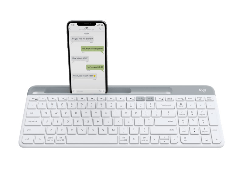 Cũng giống như bàn phím MX Keys Mini, bàn phím K580 cũng được trang bị các nút Easy Switch để cho phép bạn chuyển đổi thao tác nhập liệu giữa hai thiết bị có cùng bàn phím. Các nút tính năng này còn cho phép bạn nhập báo cáo trên máy tính sau đó chuyển đổi dễ dàng sang điện thoại di đọng và có thể đặt điện thoại trong giá đỡ ngay phía trên của bàn phím một cách tiện lợi.
