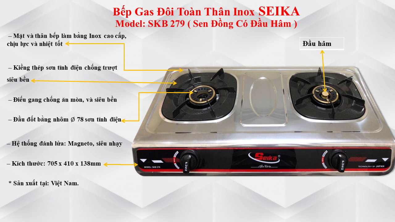 - Bếp Gas Đôi Toàn Thân Inox Seika SKB279 - Hàng Chính Hãng có thiết kế nhỏ gọn, dễ dàng phù hợp với nhiều không gian bếp, ngoài ra với bề mặt kính luôn sáng