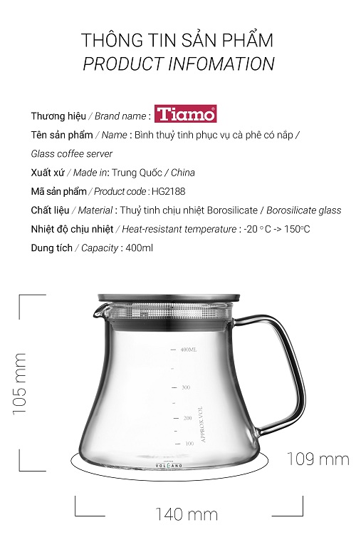 Mua tại TiktokBình phục vụ cà phê thủy tinh chịu nhiệt Tiamo 400ml nắp inox Dung tích 400ML Chất liệu: thủy tinh chịu nhiệt Borosilicate Nhiệt độ chịu nhiệt: 20 - 150 độ C Xuất xứ: Trung