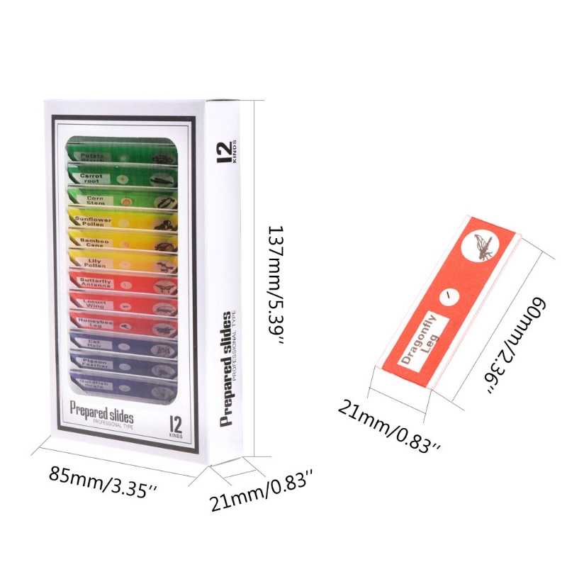 Tính năng: Bộ 12 loại mẫu vật động thực vật Được đóng gói trong một hộp trắng, mỗi mẫu được gắn nhãn với mẫu vật nhận dạng. Các mẫu được kín với một coverslip để