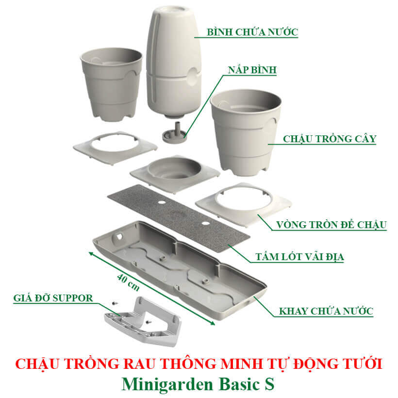 1.Mô Tả Chậu KIT Tự Dưỡng Minigarden Basic: + Nhập khẩu: Bồ Đào Nha + Kích thước Base Chậu: Ngang 38cm x 14 cm x 22 cm. Bảo Hành Chậu Tự Dưỡng Basic lên đến 10