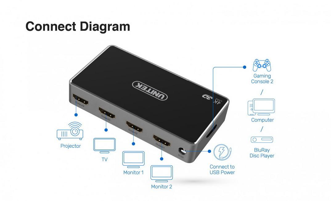 - 1 x 4K HDMI Splitter 1 In 4 Out