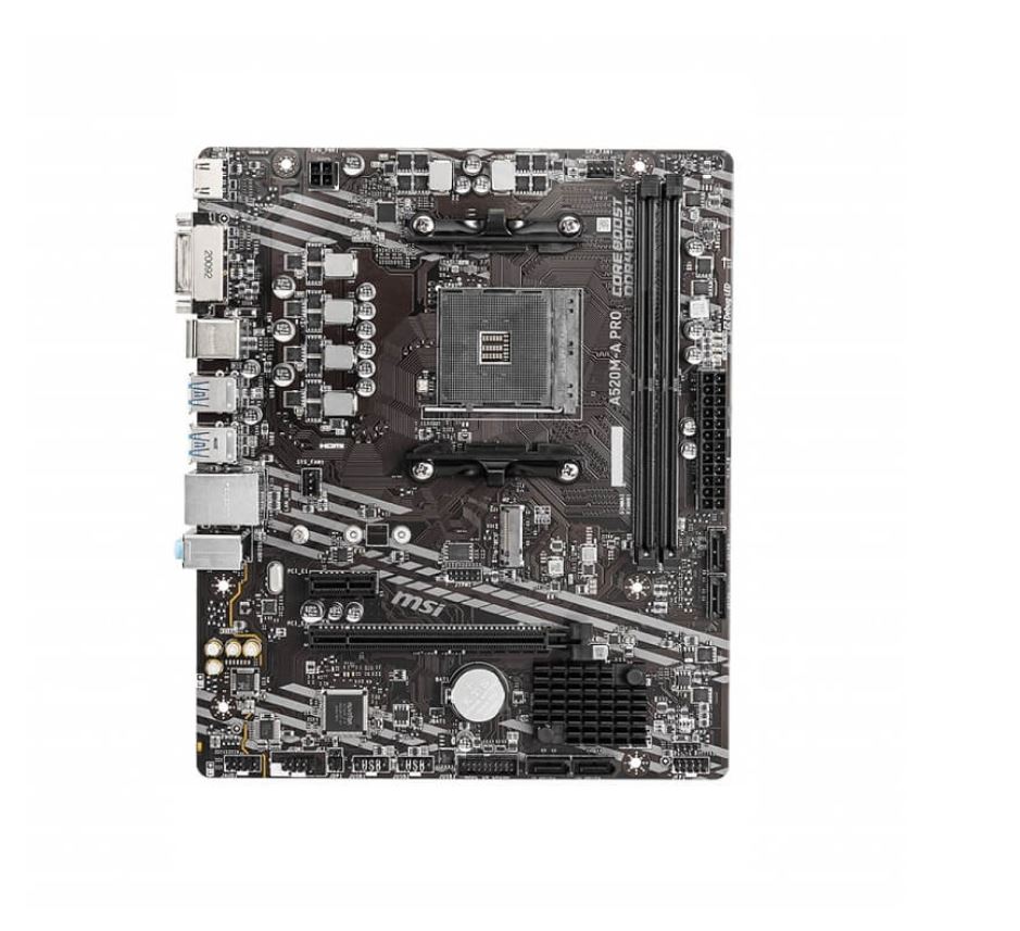 Thương hiệu MSI Dòng sản phẩm A520M-A PRO Chipset AMD A520 CPU Supports AMD Ryzen 5000 Series, 5000 G-Series, 4000 G-Series, 3000 Series and 3000 G-Series processors Memory 2x DDR4 memory slots, support up to