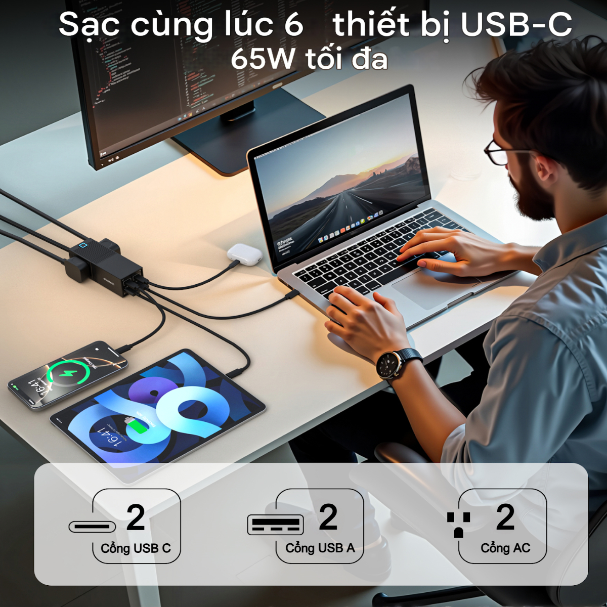 - Sạc nhanh toàn diện 65W – 2 cổng USB-C PD: Hỗ trợ sạc nhanh cho MacBook, i-Pad, iP, điện thoại Android, tablet… – 2 cổng USB-A: Tương thích với mọi thiết bị khác như tai nghe, camera, smartwatch… – Tổng công suất lên đến 65W, phân phối thông minh giữa các cổng khi sử dụng cùng lúc.
