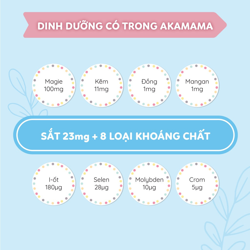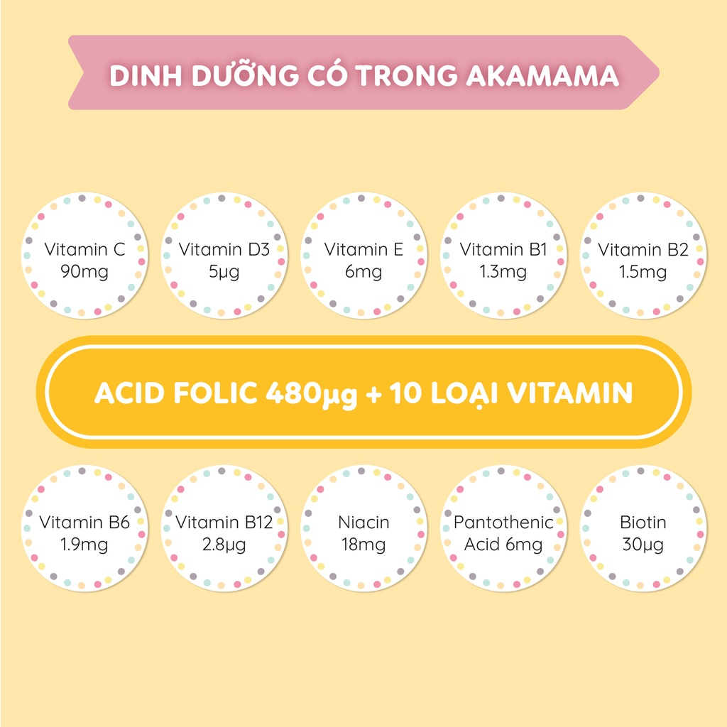 Giới thiệu Vitamin tổng hợp Akamama là sản phẩm được nhiều mẹ bầu tin dùng để bổ sung đầy đủ các vitamin và khoáng chất cần thiết cho cả mẹ và bé trong suốt thai kỳ. Với thành phần tự nhiên và công thức khoa học, Akamama giúp hỗ trợ sức khỏe của mẹ bầu, đảm bảo sự phát triển toàn diện của thai nhi. Đặc điểm nổi bật Bổ sung 11 loại vitamin và 9 loại khoáng chất cùng lợi khuẩn giúp hỗ trợ tăng cường sức khỏe cho phụ nữ trong giai đoạn chuẩn bị mang thai, đang mang thai và cho con bú.