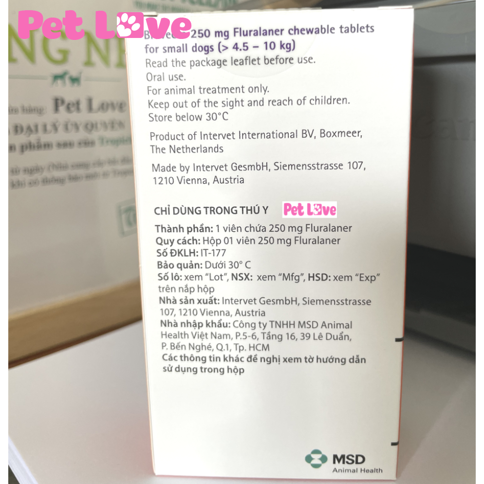 Quy cách: 1 Hộp/ 1 Viên nhai Thành phần Mỗi viên nhai có chứa: Fluralaner Có 03 qui cách: Viên 45 mg Fluralaner dùng cho chó 2-4.5 kg Viên 100 mg Fluralaner dùng cho chó
