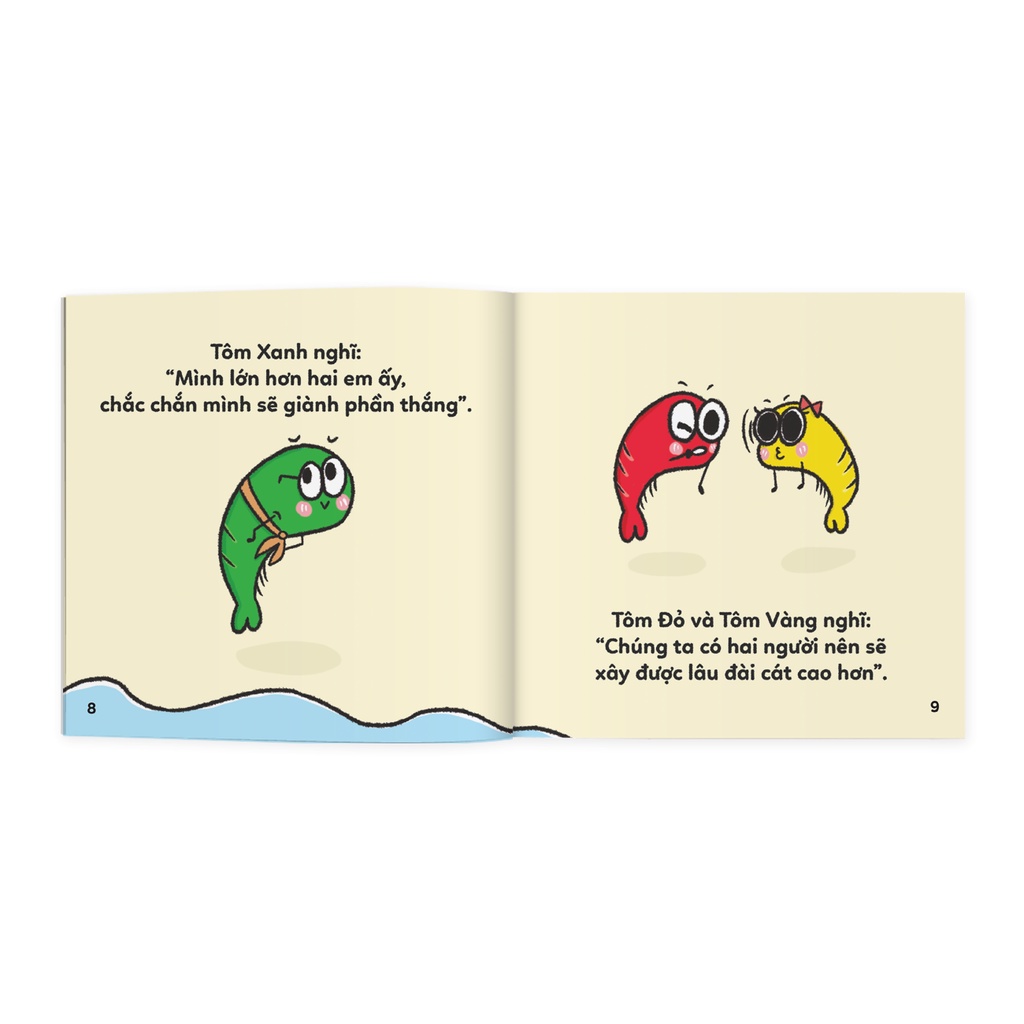 - "Cao thấp" là câu chuyện về 3 chú tôm: Tôm Xanh, Tôm Đỏ, Tôm Vàng rủ nhau thi xây lâu đài cát. Ai cũng nỗ lực để dành phần thắng về đội mình. Quá trình và kết quả xây lâu đài của ba chú tôm giúp bé học được phép so sánh: CAO – THẤP.