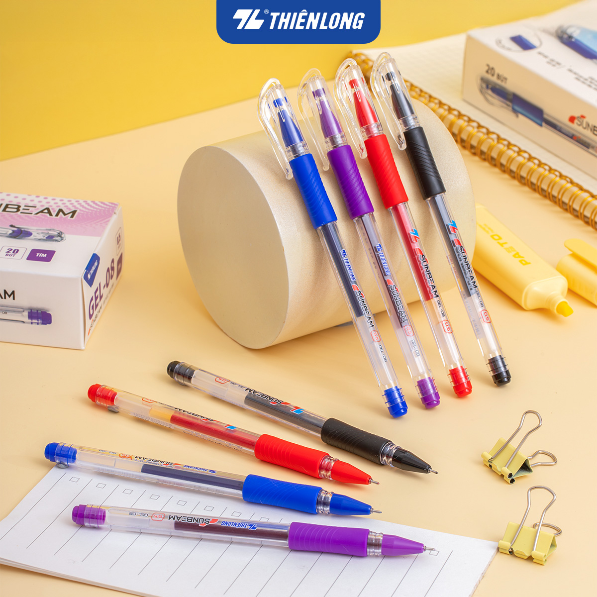 Thông số kĩ thuật : Tên danh mục Bút Gel Thương hiệu Thiên Long Đường kính viên bi 0.5 mm Màu mực Đen / đỏ / tím / xanh Trọng lượng 10 gram Tính năng