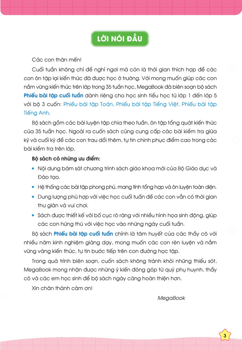 - Hệ thống các bài tập phong phú, mang tính tổng hợp và ôn luyện toàn diện. Hệ thống bài tập đa dạng, lượng phù hợp với việc học cuối tuần để các con vẫn có thời gian thư giãn và vui chơi. Đặc biệt, sau mỗi kì sẽ có bài ôn tập giữa kì và cuối kì giúp con có tài liệu ôn tập cho các kì kiểm tra.