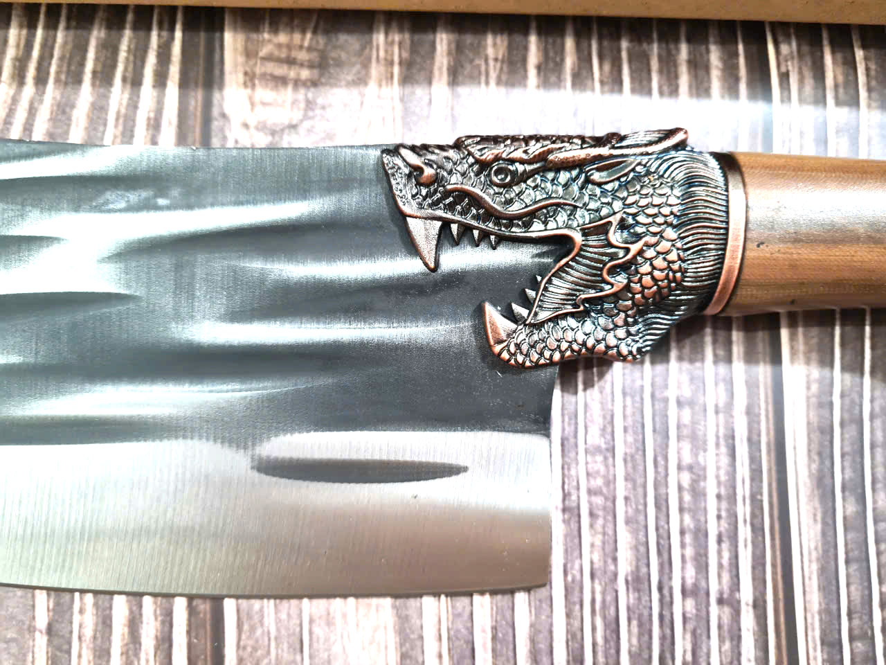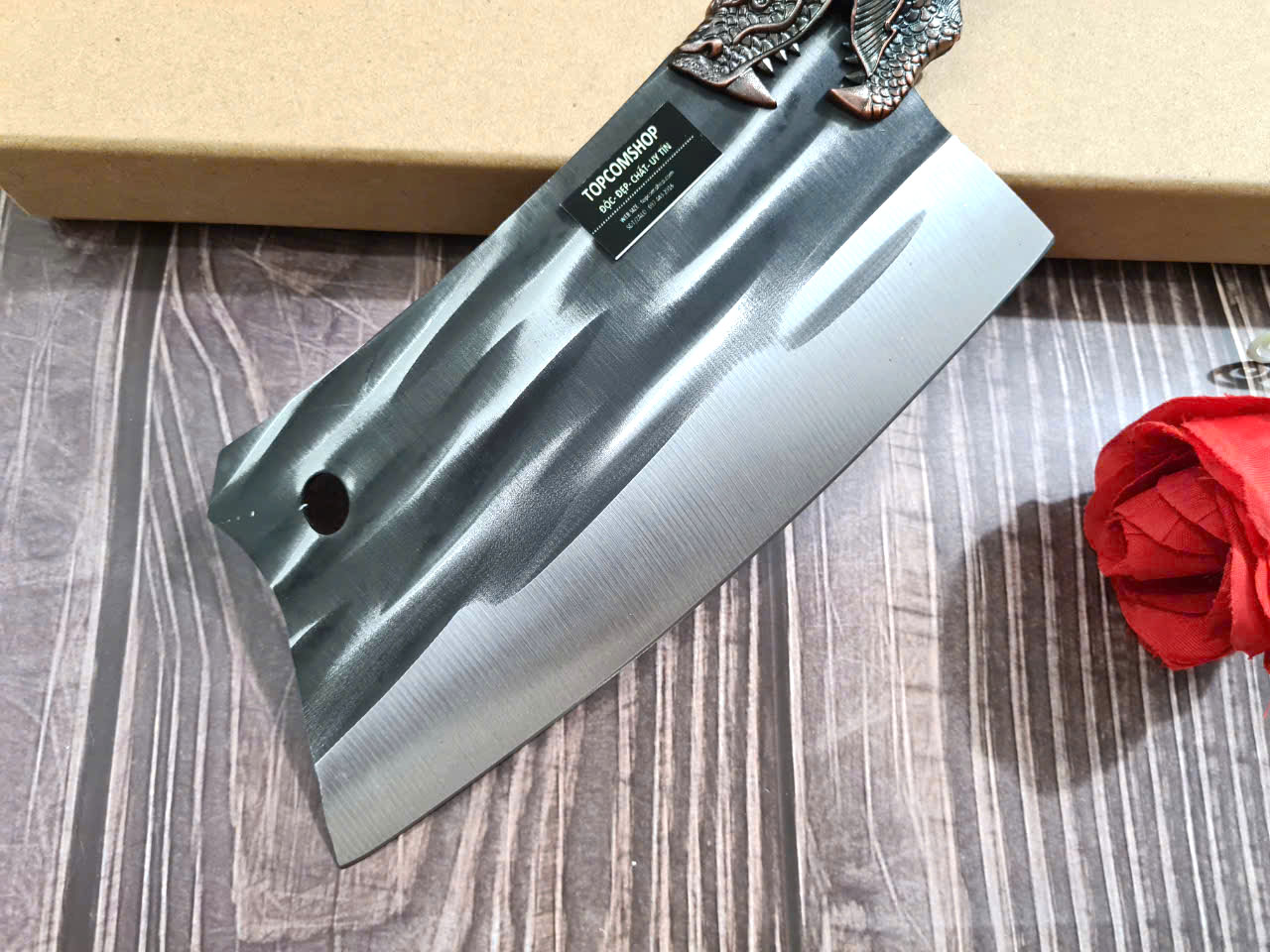 - Chức năng: Chặt xương ống, chân giò, trâu bò - Kích thước: Lưỡi: 22cm, cán: 10cm, rộng: 10cm, dầy: 5ly, trọng lượng: 800g - Cán : Gỗ mun, Khâu đồng đỏ , chốt đinh