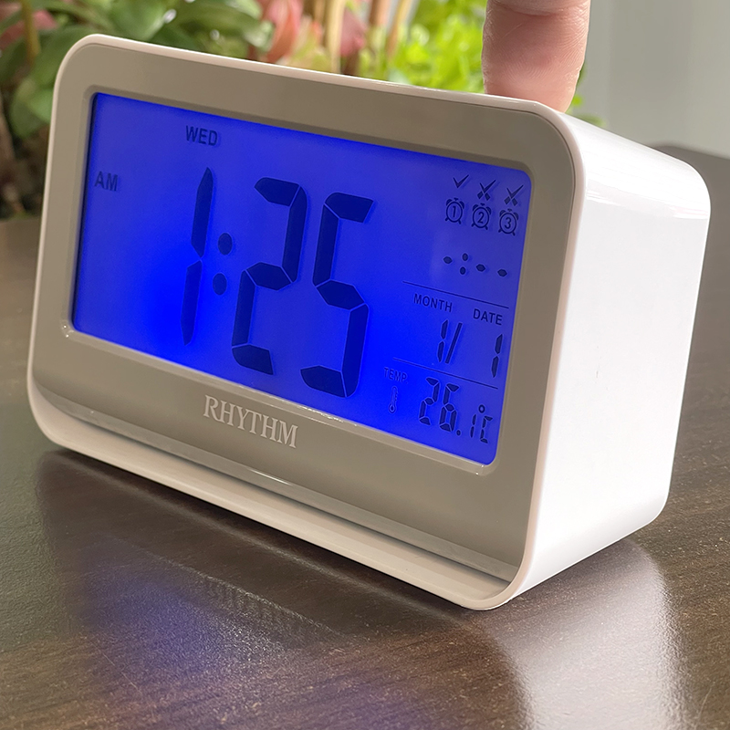 Đồng hồ để bàn báo thức Rhythm LCT097NR03 – KT 15.0 x 8.8 x 5.0cm, trọng lượng 190g. Vỏ nhựa. Dùng Pin. Màn hình tinh thể lỏng LCD có thể chỉnh độ đậm nhạt chữ.