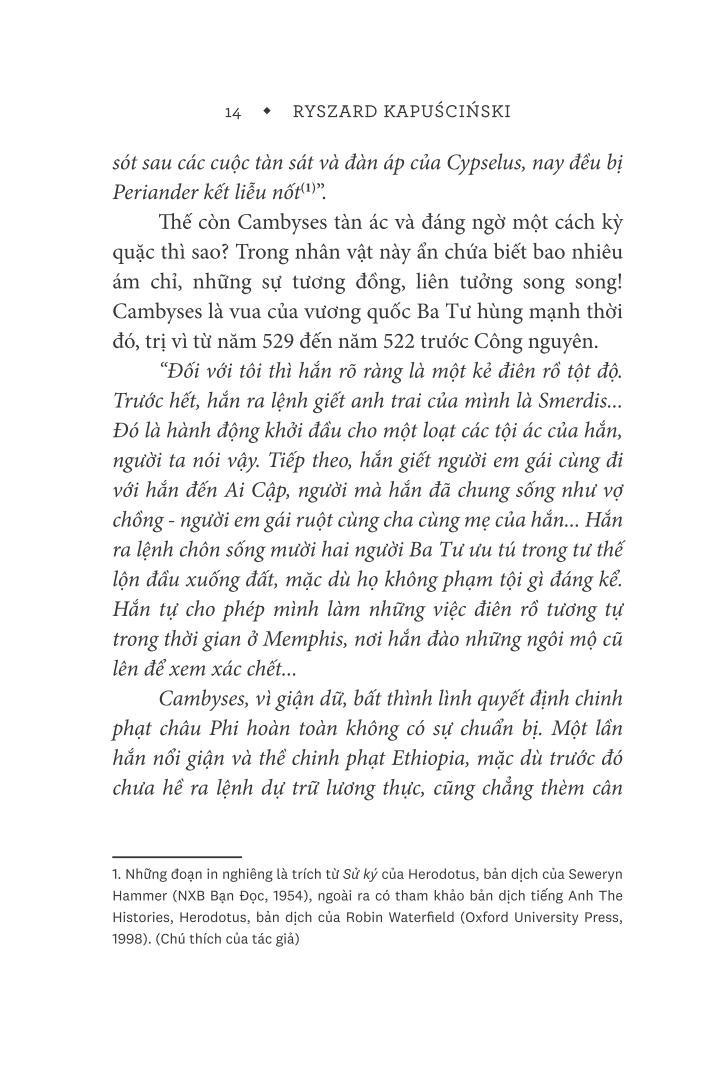 Du ký là mảnh đất màu mỡ lúc xa xôi khi lạ lẫm vẫn là ấn tượng của con người về thế giới rộng lớn bên ngoài. Tưởng chừng sự hoàn thành quá trình tìm hiểu cặn kẽ những miền đất lạ đã tước đi chỗ đứng của những nhà văn ưa phiêu lưu như Pierre Lot, Blaise Cendrars hay Rudyard Kipling, chấm dứt cái thời Paul Morand cảm khái mà thốt lên rằng: "Đi là chết một ít, nhưng ở lại là vỡ tan thành trăm mảnh” (Những cuộc du hành). Vậy nhưng, thế giới hiện đại của chúng ta vẫn còn những người như V.S. Naipaul và nhất là Ryszard Kapuściński, một con người xê dịch, một thiên tài của sự quan sát và xâu chuỗi quá khứ với hiện tại. Nhà văn Ba Lan nhiều lần có tên trong danh sách ứng cử viên giải Nobel Văn học đã kể cho ta về châu Á, châu Phi trong một giọng văn đầy hùng khởi nhưng tỉnh táo và tỉ mỉ, mô tả con người ở khắp các ngóc ngách thế giới bằng một chủ nghĩa nhân văn được truyền lại theo một con dường kỳ bí nào đó từ phản sáng chói của lịch sử nhân loại. Và không chỉ có vậy, ông còn mang trở lại cho chúng ta một sử gia Hy Lạp ít nhiều bị lãng quên: Herodotus