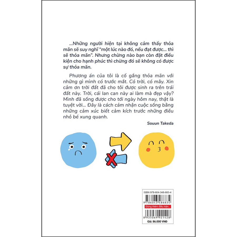 Hạnh phúc nhìn chung có hai loại. Loại thứ nhất là hạnh phúc do thay đổi cảm xúc của bản thân vì yếu tố bên ngoài. Vì thu nhập giảm nên chúng ta cảm thấy đau khổ. Vì không được nhìn nhận nên chúng ta cảm thấy hổ thẹn. Đây gọi là loại “hạnh phúc phản ứng với điều kiện bên ngoài”. Nếu thu nhập tăng thêm một chút thì cuộc sống đã nhàn hạ hơn rồi. Chỉ cần mình kết hôn thì cuộc sống có lẽ đã hạnh phúc hơn rồi. Con người thường trở nên tiêu cực khi họ so sánh bản thân với thứ gì đó, hoặc khi không đạt được kì vọng. Điều này xuất hiện bởi họ luôn suy nghĩ hạnh phúc phải đi kèm với “điều kiện”. Loại hạnh phúc thứ hai là hạnh phúc không kèm điều kiện. Những người thuộc nhóm này thường có được hạnh phúc trước sau đó mới tìm thấy lý do. Thế giới xung quanh thay đổi phụ thuộc vào cách bạn nhận thức. Dù bạn chẳng làm gì sai nhưng sẽ luôn có người không thích bạn hoặc nói những điều khó nghe về bạn. Mỗi khi như vậy, nếu là một người hay đặt cảm xúc vào những “phản ứng bên ngoài” thì chắc chắn bạn sẽ cảm thấy rất mệt mỏi. Vậy làm thế nào để bạn thay đổi được cách tiếp nhận những điều đó. Bất kỳ ai cũng có thể bị ảnh hưởng bởi những “tiêu cực vô thức” mà không hay biết. Có nhiều thứ tích tụ lại và trở thành nền tảng nhận thức của chúng ta. Đó có thể là những thông tin từ ti vi, tạp chí, internet, hay những ý kiến tiêu cực của bạn bè, bố mẹ, thầy cô. Khi bạn bật tivi lên, họ nói “Thật không may, trời lại mưa”, điều đó tạo ra ý nghĩa tiêu cực “Trời mưa à, thật chán”. Để chống lại những ảnh hưởng của “tiêu cực vô thức” thì đầu tiên bạn phải nhận thức được rằng, xung quanh bạn có người tiêu cực những cũng có những người tích cực. Ẩn sâu bên trong cảm xúc tiêu cực của bạn chắc chắn có chứa những mặt tích cực. Cho dù có thấy bất mãn, bất hạnh thế nào đi chăng nữa, nếu thay đổi góc nhìn thì chắc chắn khung cảnh xung quanh sẽ thay đổi. Cuốn sách Đừng thêm điều kiện cho hạnh phúc sẽ là cuốn sách giúp bạn cân bằng cảm xúc cá nhân, điều chỉnh các mối quan hệ đồng nghiệp, bạn bè, người thân để có thể an yên và hạnh phúc mỗi ngày. Tác giả: Souun Takeda là một nhà thư pháp và nghệ sĩ đương đại đến từ tỉnh Kumamoto, sinh năm 1975. Hiện tại ông là NHÓM NOMUDAS Lấy dịch thuật làm nền tảng, NOMUDAS chia sẻ các nội dung liên quan tới sản xuất, kaizen, quản lý Nhật Bản thông qua xuất bản sách ở Việt Nam và các cổng thông tin khác. Những bộ sách do nhóm dịch như Bí quyết thành công của các doanh nghiệp hàng đầu thế giới (11 cuốn); Sống sót sau những cú shock kinh doanh – 3 cuốn; Những công ty đáng trân trọng nhất nước Nhật – 3 cuốn…