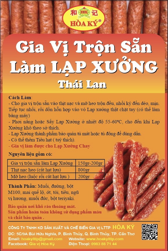 - Gia vị trộn sẵn làm Lạp Xưởng: 150gr- 200gr. -Thịt nạc heo ( cắt hạt lựu ) 800gr -Mỡ heo (luộc rồi cắt hạt lựu )200gr Tiêu ( tuỳ thích) Cách Làm: -Cho gia vị trộn sẵn vào thịt nạc và mỡ heo trộn đều, nhồi kỷ đến dẻo, mịn. Tiếp tục nhồi, rồi dồn hỗn hợp vào vỏ Lạp xưởng thật chặt tay ( có thể làm bằng máy ). -Phơi nắng hoặc Sấy Lạp Xưởng ở nhiệt độ 55-60*c ,cho đến khi Lạp Xưởng khô theo sở thích. -Lạp Xửơng thành phẩm bảo quản tủ mát hoặc tủ đông để dùng dần. Gia Vị làm được cho Lạp Xưởng Chay . Bảo quản nơi khô ráo thoáng mát. Sản phẩm hoàn toàn không sử dụng phẩm màu và chất bảo quản .