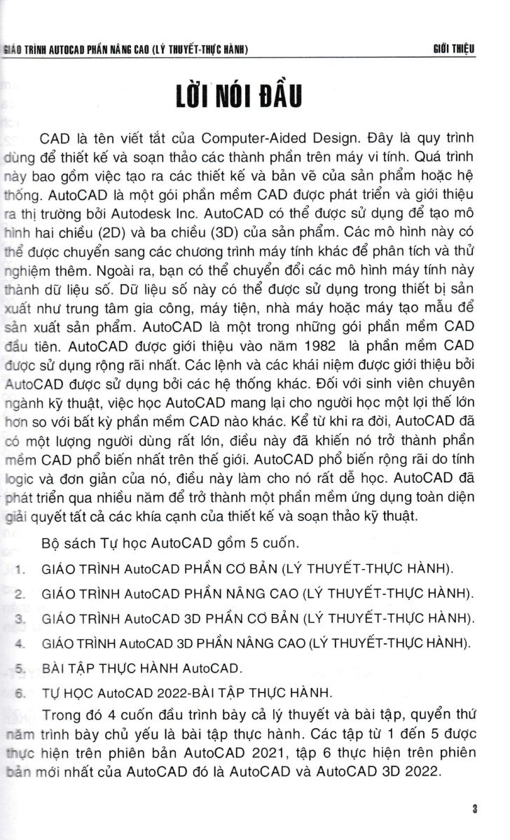 Trong đó 4 cuốn đầu trình bày cả lý thuyết và bài tập, quyển thứ năm trình bày chủ yếu là bài tập thực hành. Các tập từ 1 đến 5 được thực hiện trên phiên bản AutoCAD 2021, tập 6 thực hiện trên phiên bản mới nhất của AutoCAD đó là AutoCAD và AutoCAD 3D 2022 .
