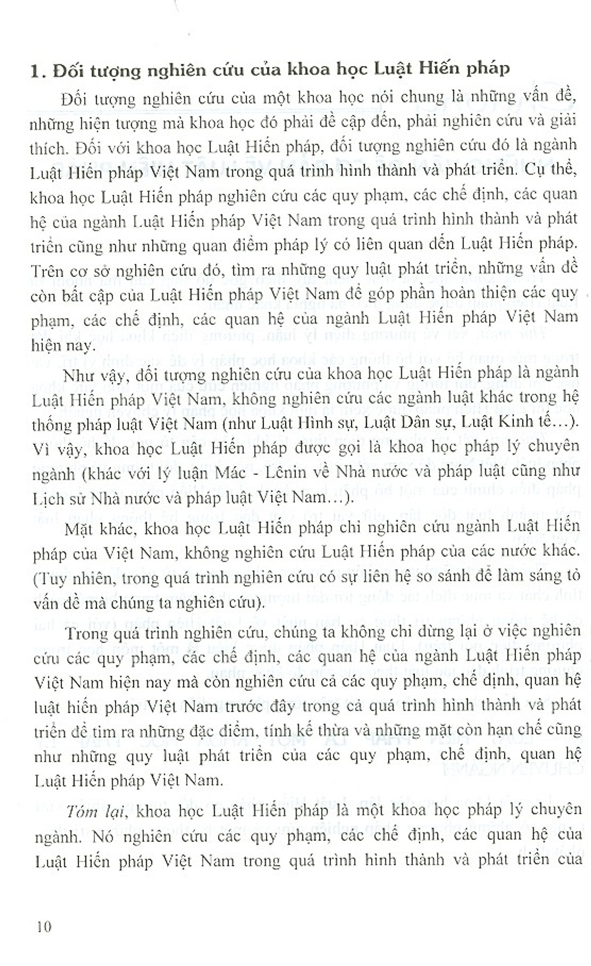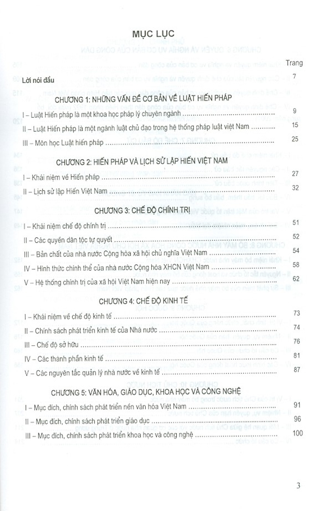 Mua tại TiktokChương 1: Những vấn đề cơ bản về luật hiến pháp. Chương 2: Hiến pháp và lịch sử lập hiến Việt Nam. Chương 3: Chế độ chính trị. Chương 4: Chế độ kinh tế. Chương 5: Văn hóa, giáo dục, khoa học và công nghệ. Chương 6: Quyền và nghĩa vụ cơ bản của công dân. Chương 7: Chế độ bầu cử. Chương 8: Bộ máy Nhà nước Cộng Hòa Xã Hội Chủ Nghĩa Việt Nam. Chương 9: Quốc hội. Chương 10: Chủ tịch nước. Chương 11: Chính phủ. Chương 12: Hội đồng nhân dân. Chương 13: Ủy ban nhân dân. Chương 14: Tòa án nhân dân. Chương 15: Viện kiểm sát nhân dân.