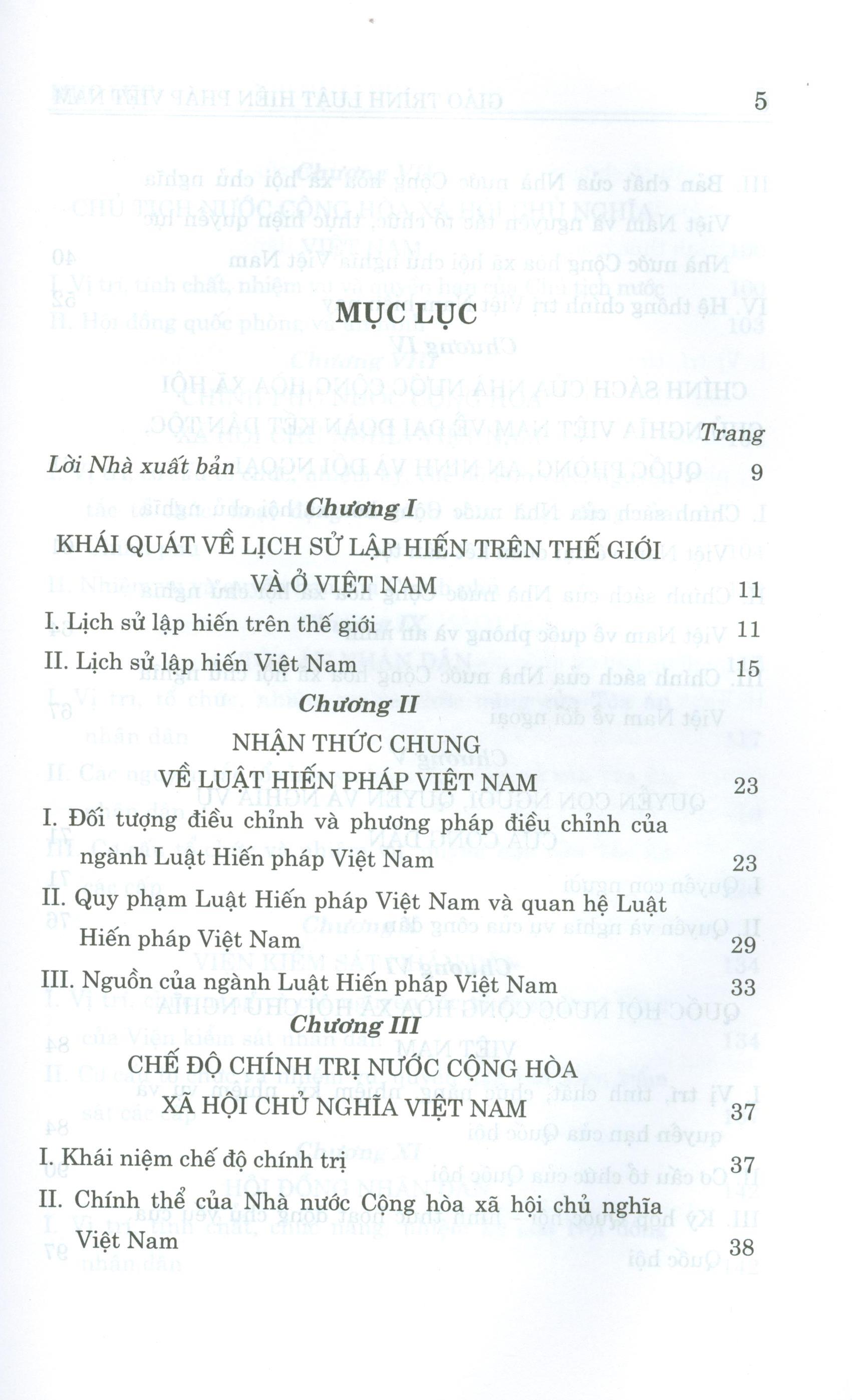 Chương 1: Những vấn đề cơ bản về luật hiến pháp. Chương 2: Hiến pháp và lịch sử lập hiến Việt Nam. Chương 3: Chế độ chính trị. Chương 4: Chế độ kinh tế. Chương
