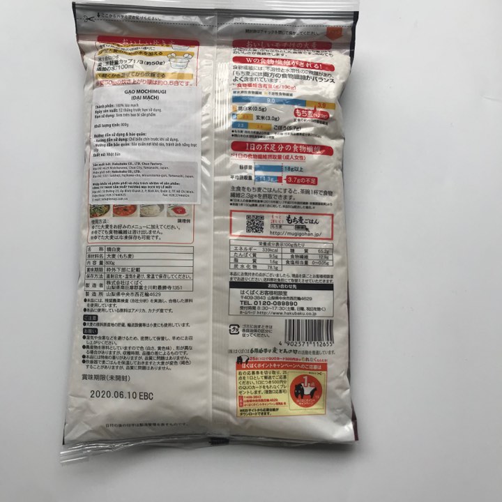 HẠT ĐẠI MẠCH MOCHIMUGI HAKU BAKU (800gr)HSD: Tháng 2/2024Là một loại lúa mạch không gluten, chứa đựng những điều tuyệt vời sau :Hạt còn nguyên lớp mầm bổ dưỡngGiàu chất sơ Gấp 5 lần gạo tẻ và 4 l...