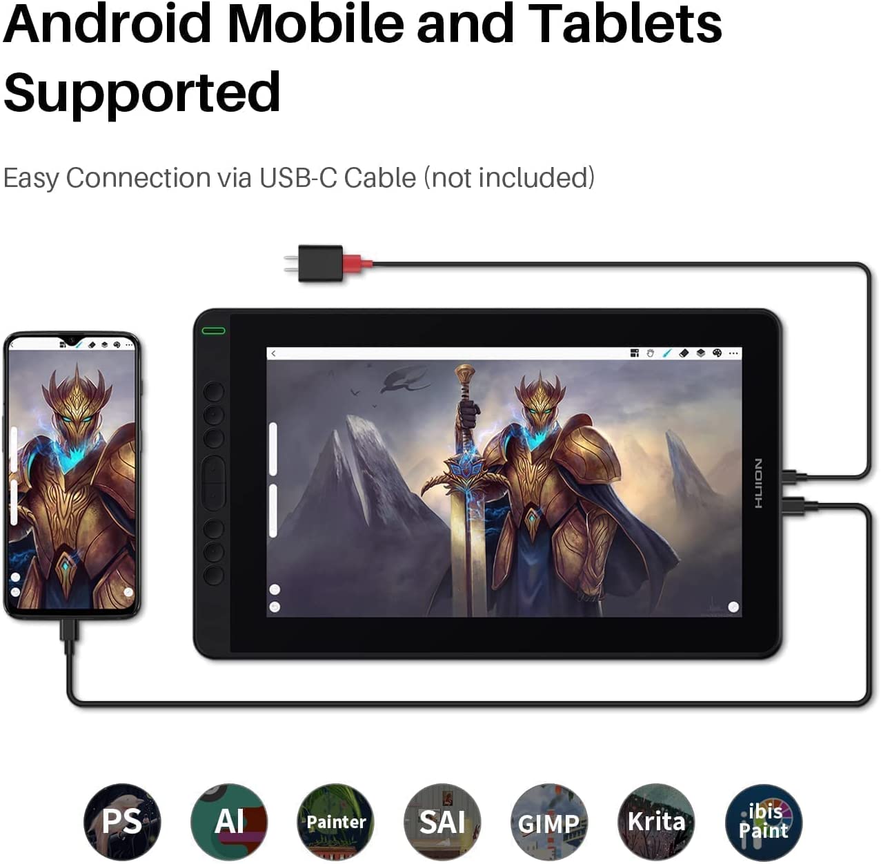 Mua tại TiktokBảng vẽ LCD Huion Kamvas 13 (Android), màn hình IPS 13.3in, full HD 1920×1080, tỷ lệ 16:9, độ phân giải bảng vẽ 5080lpi, bút vẽ PW517 không pin 8192 mức lực nhấn, cảm ứng ±60° nghiêng, kết nối USB-C. Hai chế độ sử dụng, bảng vẽ/bảng vẽ LCD.