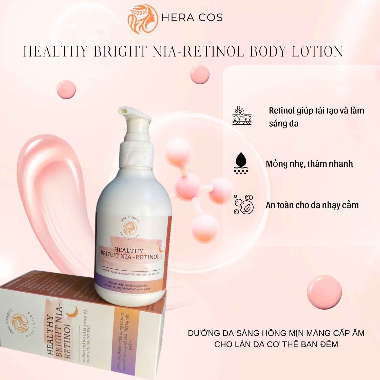 KEM BODY ĐÊM RETINOL Tên sản phẩm: HEALTHY BRIGHT NIA - RETINOl BODY LOTION Tên thương hiệu: HERACOS Dung tích: 200gr Thành phần chính: Water, Glycerin, Sodium Polyacrylate, C13-14 Isoparaffin, Laureth-7, C12‐15 Alkyl Benzoate, Propylene