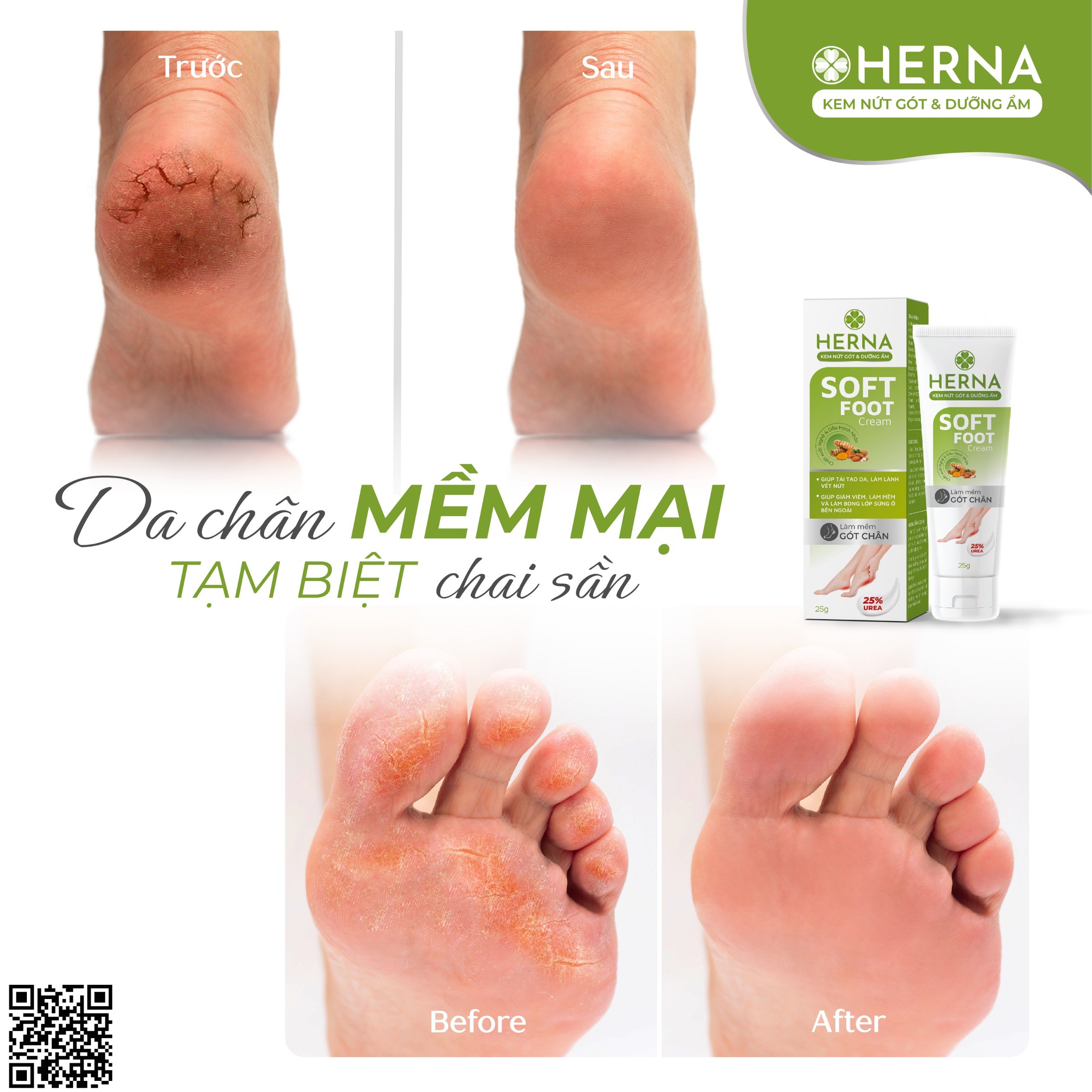 KEM NỨT GÓT & DƯỠNG ẨM Herna - Giúp cải thiện tình trạng da khô rát, nứt nẻ, bong tróc, sần sùi THÀNH PHẦN Purified Water (Nước tinh khiết), Semen Armeniacae Amarum Oil (Dầu