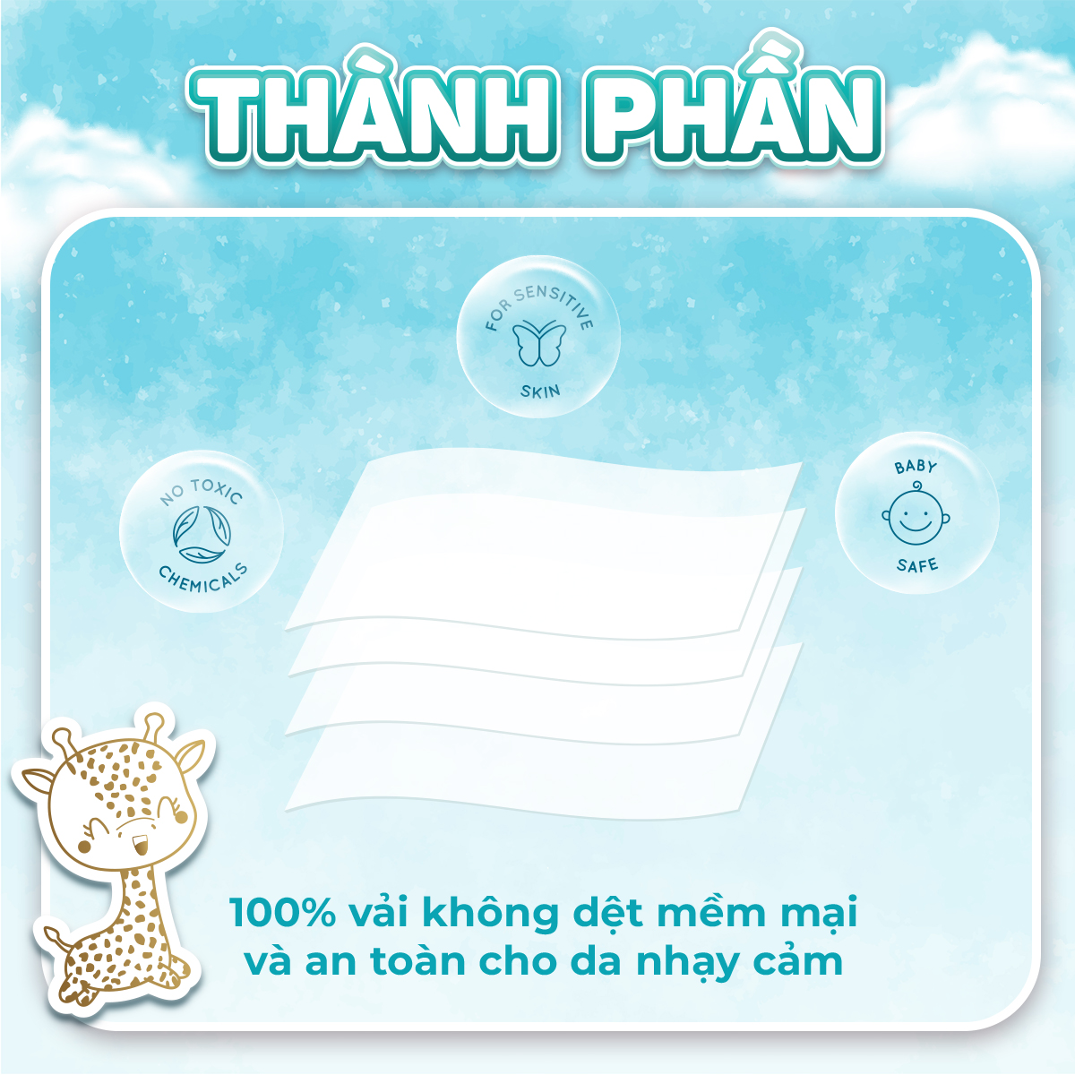 Được làm từ sợi vải không dệt, rất dai, mềm, mịn và có độ đàn hồi cao. Dạng khô, thích hợp cho làn da nhạy cảm nhất. An toàn cho bé, tiết kiệm cho mẹ.