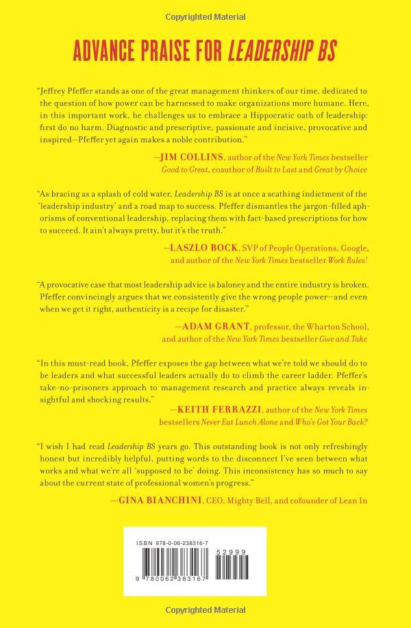 Finalist for the 2015 Financial Times and McKinsey Business Book of the Year Best business book of the week from I The author of Power, Stanford business school professor, and a leading management thinker offers a hard-hitting dissection of the leadership industry and ways to make workplaces and careers work better. The leadership enterprise is enormous, with billions of dollars, thousands of books, and hundreds of thousands of blogs and talks focused on improving leaders. But what we see worldwide is employee disengagement, high levels of leader turnover and career derailment, and failed leadership development efforts. In Leadership BS, Jeffrey Pfeffer shines a bright light on the leadership industry, showing why it's failing and how it might be remade. He sets the record straight on the oft-made prescriptions for leaders to be honest, authentic, and modest, tell the truth, build trust, and take care of others. By calling BS on so many of the stories and myths of leadership, he gives people a more scientific look at the evidence and better information to guide their careers. Rooted in social science, and will practical examples and advice for improving management, Leadership BS encourages readers to accept the truth and then use facts to change themselves and the world for the better.
