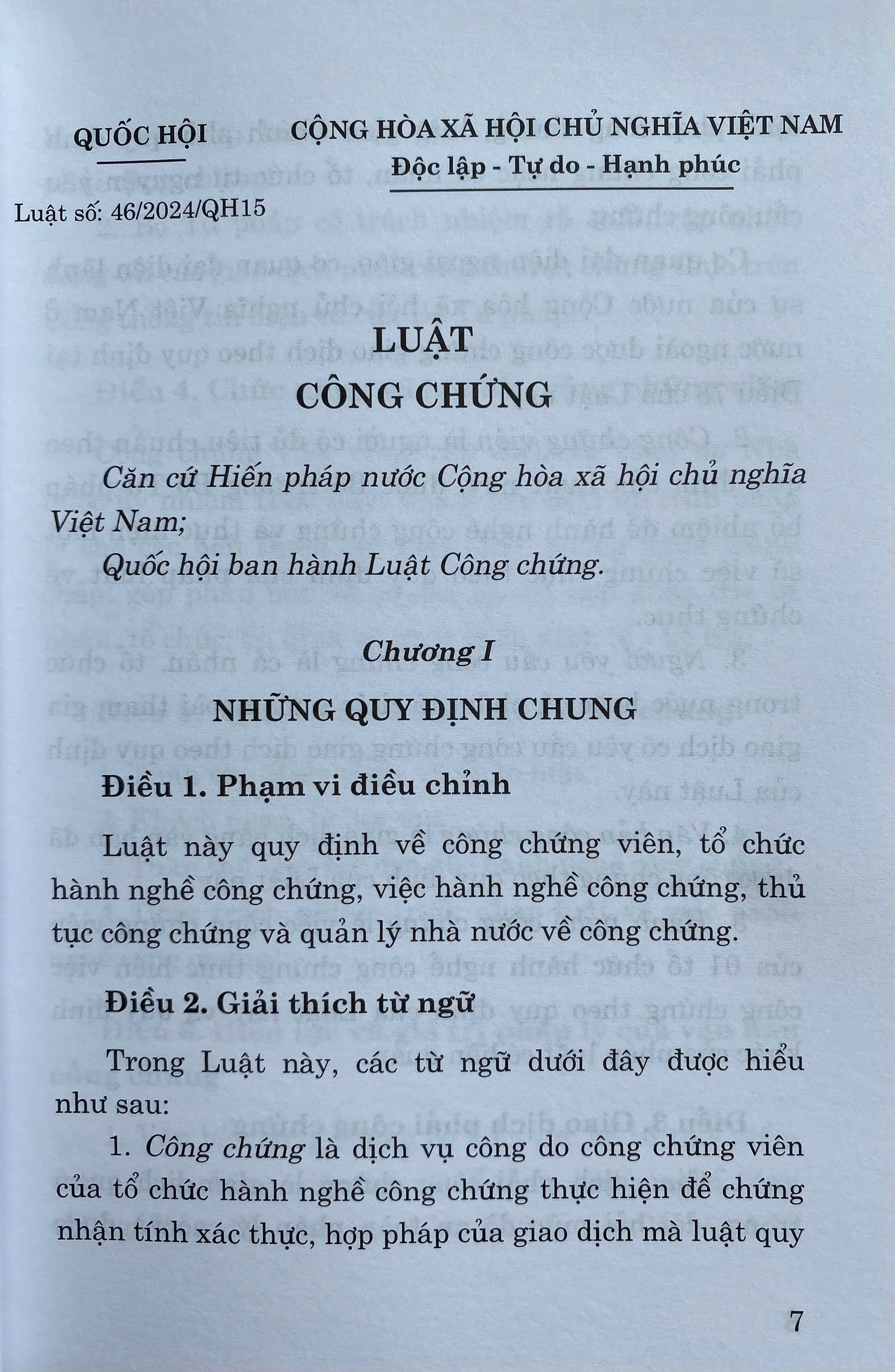 Luật Công Chứng số 46/2024/QH15 đã được Quốc Hội khoá XV thông qua tại kỳ họp thứ 8 ngày 26 tháng 11 năm 2024. Luật có hiệu lực áp dụng từ ngày 01 tháng 07 năm 2025. Luật gồm có 8 Chương, 76 điều.