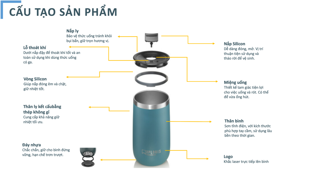 Ly giữ nhiệt Xploris Ưu điểm và tiện ích: Ly giữ nhiệt thời trang, thân thiện với môi trường cùng hai màu xanh đặc trưng: xanh lá đậm và xanh da trời. - Logo được khắc trên bề mặt sản phẩm phong cách năng động, trẻ trung cá tính - Sản phẩm phù hợp với các bạn trẻ yêu thích thiên nhiên, môi trường, thời trang, sành điệu. - Khả năng giữ nóng, lạnh tốt với hai lớp giữ nhiệt thép không gỉ, có thể giữ nóng đến 4H và lạnh đến 16H* - Thân ly sơn tĩnh