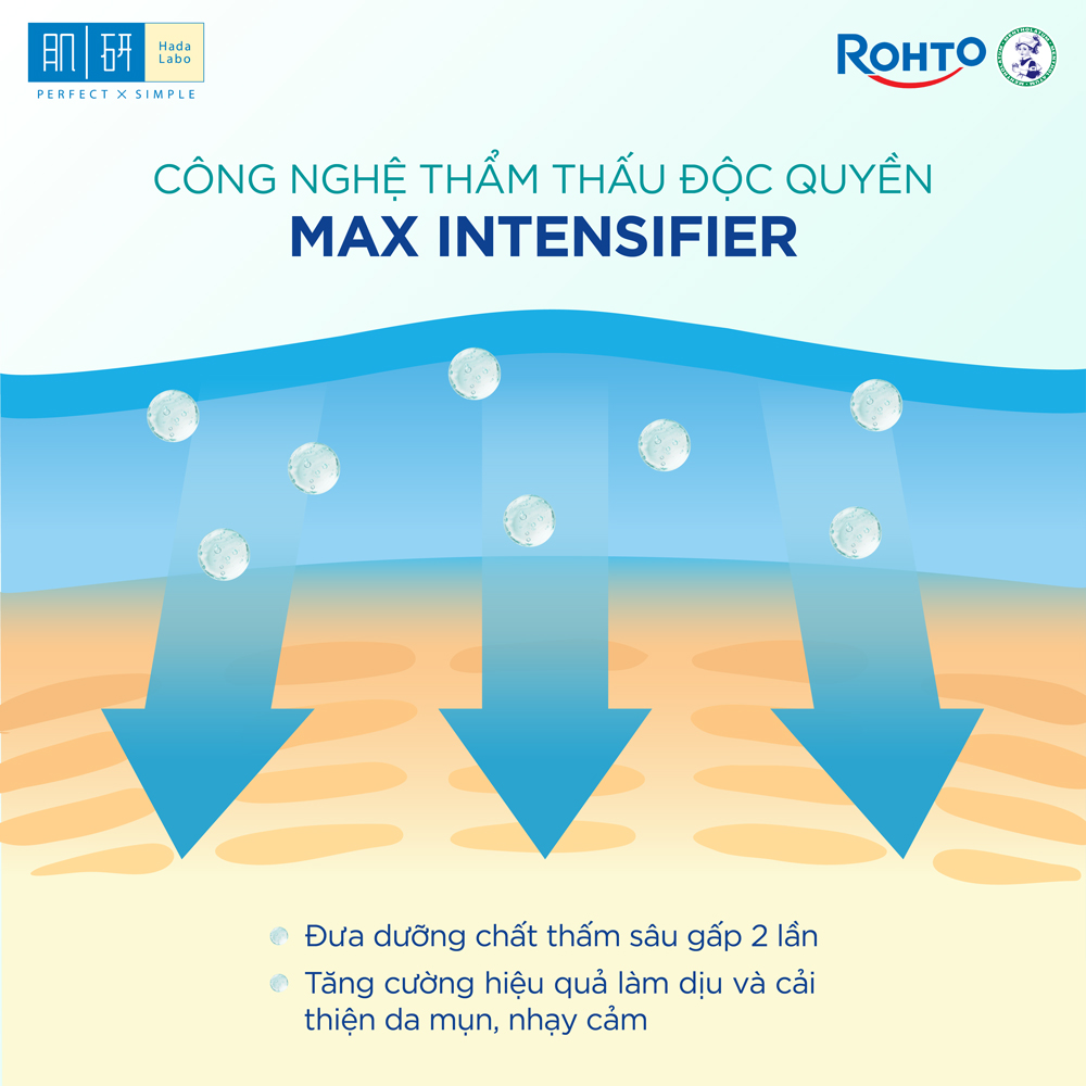 • Công nghệ Max Intensifier từ Nhật Bản giúp đưa các dưỡng chất thấm sâu vào lớp biểu bì gấp 2 lần, tăng cường hiệu quả làm dịu và cải thiện da mụn, nhạy cảm.