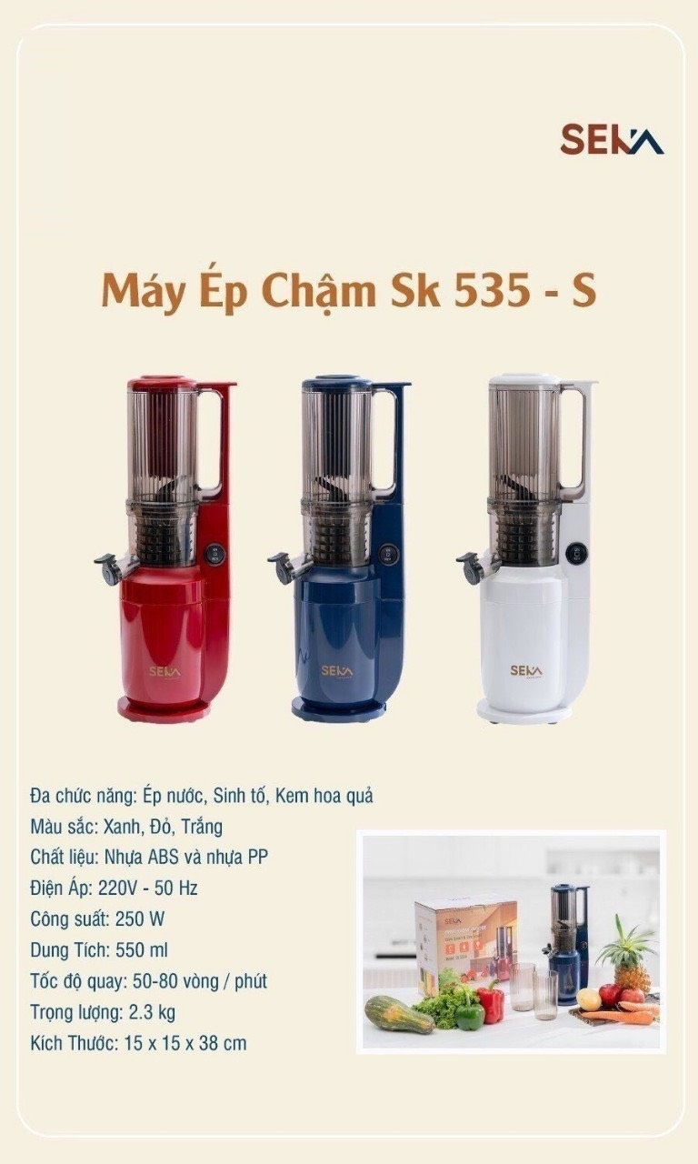 Cuộc sống hiện đại bận rộn khiến nhiều người không có thời gian để chuẩn bị những bữa ăn đầy đủ dinh dưỡng. Nước ép trái cây, rau củ là giải pháp tiện lợi giúp bổ sung vitamin và khoáng chất thiết yếu cho cơ thể. Tuy nhiên, việc sử dụng máy ép thông thường có thể làm mất đi một phần dưỡng chất và hương vị của trái cây. Máy ép chậm SEKA SK535S ra đời chính là để giải quyết vấn đề này.