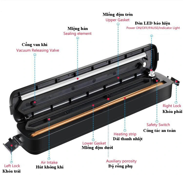- Bước 4: Tắt nguồn và mở khóa lắp hai bên sau đó lấy thành phẩm đã được hút chân không. NHỮNG ĐIỀU CẦN CHÚ Ý KHI SỬ DỤNG MÁY ÉP CHÂN KHÔNG 1: Không sờ vào bộ phận hàn túi của máy hút chân không khi đang cắm điện 2: Không sử dụng các chất tẩy rửa mạnh. 3: Không để máy bị ướt khi mưa hoặc vào nước. 4: Không để các nguồn nhiệt nóng lên trên máy. 5: Tránh xa tầm tay trẻ em. 6: Máy không hút nước, không hút thực phẩm dạng bột.