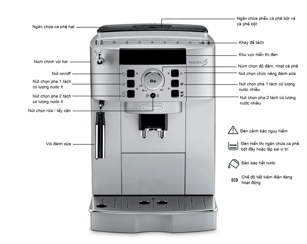 - Thiết kế sang trọng, nhỏ gọn - Thích hợp dùng cho văn phòng, gia đình - 2 vòi pha Espresso - 1 vòi đánh sữa Cappuccino, Latte - Đèn báo hiệu nước đun sôi