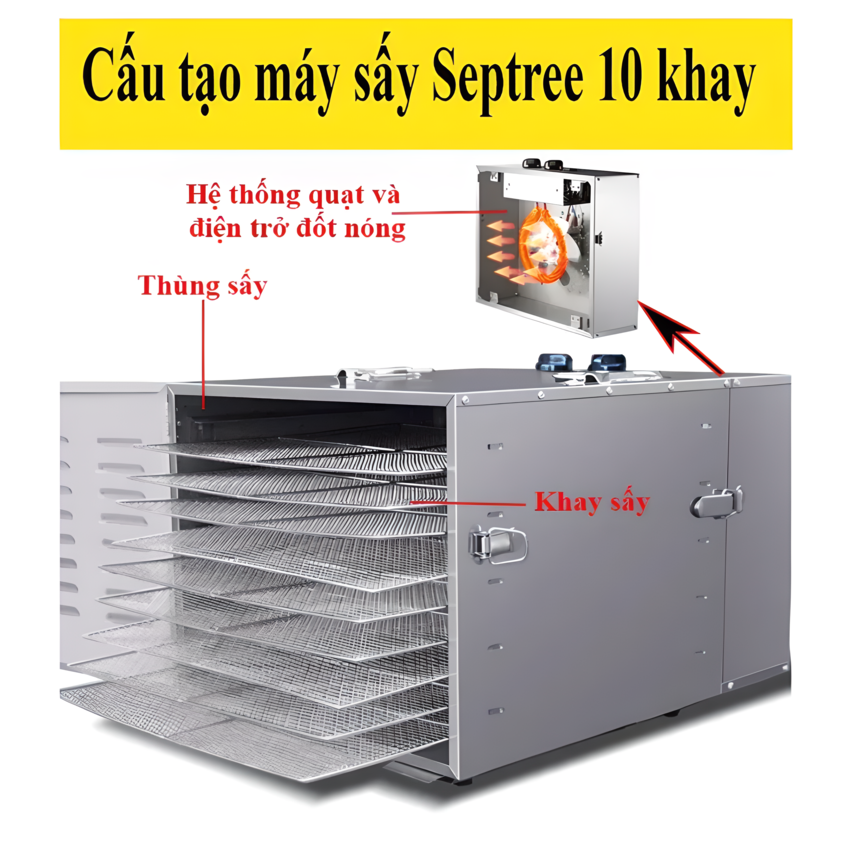 - Máy sấy Septree 10 khay, có phạm vi nhiệt độ sấy vào khoản từ 30 độ C đến 90 độ C, có thể sử dụng để sấy khô, sấy dẻo hầu hết các loại nông sản, hoa quả, thực phẩm có kích thước phù hợp với công suất thiết kế của máy.