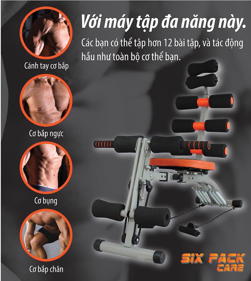 Máy tập cơ bụng đa năng New Six Pack Care là 1 chiếc máy 5 trong 1 tác động lên các cơ chính như cánh tay, đùi, bụng, lưng, vai, chân