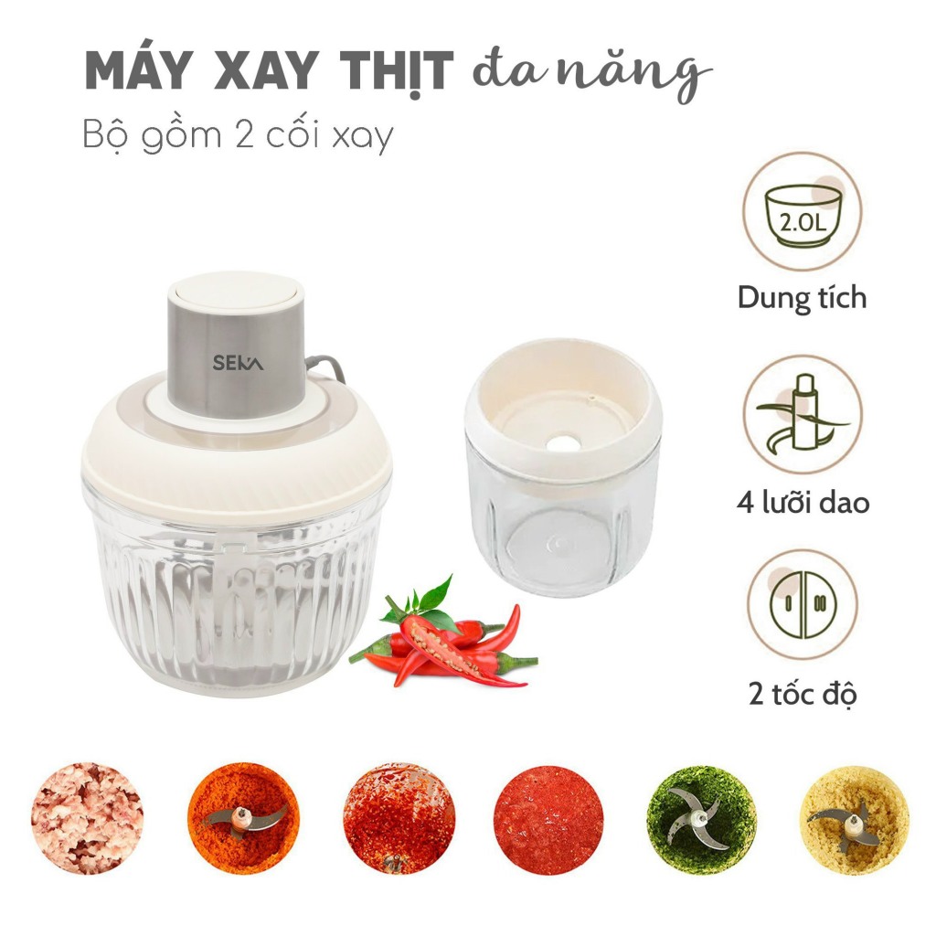 Mua tại TiktokMáy xay thịt đa năng SEKA SK2287 chính hãng 2 cối thuỷ tinh, công suất 500W Việc nấu nướng mỗi ngày sẽ trở nên đơn giản, nhanh chóng hơn với Máy xay thịt SEKA SK2287, một "trợ thủ" gian bếp có thiết kế hiện đại, đa năng mang đến những món ăn ngon đầy đủ dinh dưỡng cho gia đình. I) THÔNG TIN SẢN PHẨM MÁY XAY THỊT SEKA SK2287