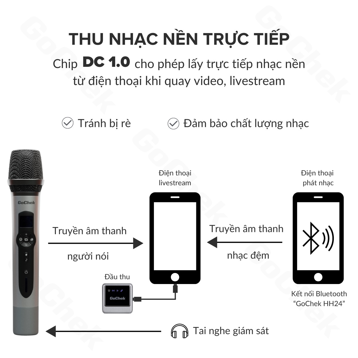 Mic karaoke GoChek HH24 đem đến trải nghiệm hát chuyên nghiệp như phòng thu nhờ chip DC 1.0 giúp thu nhạc nền trực tiếp giúp chất lượng âm thanh khi lên video/livestream sống động và không bị rè.
