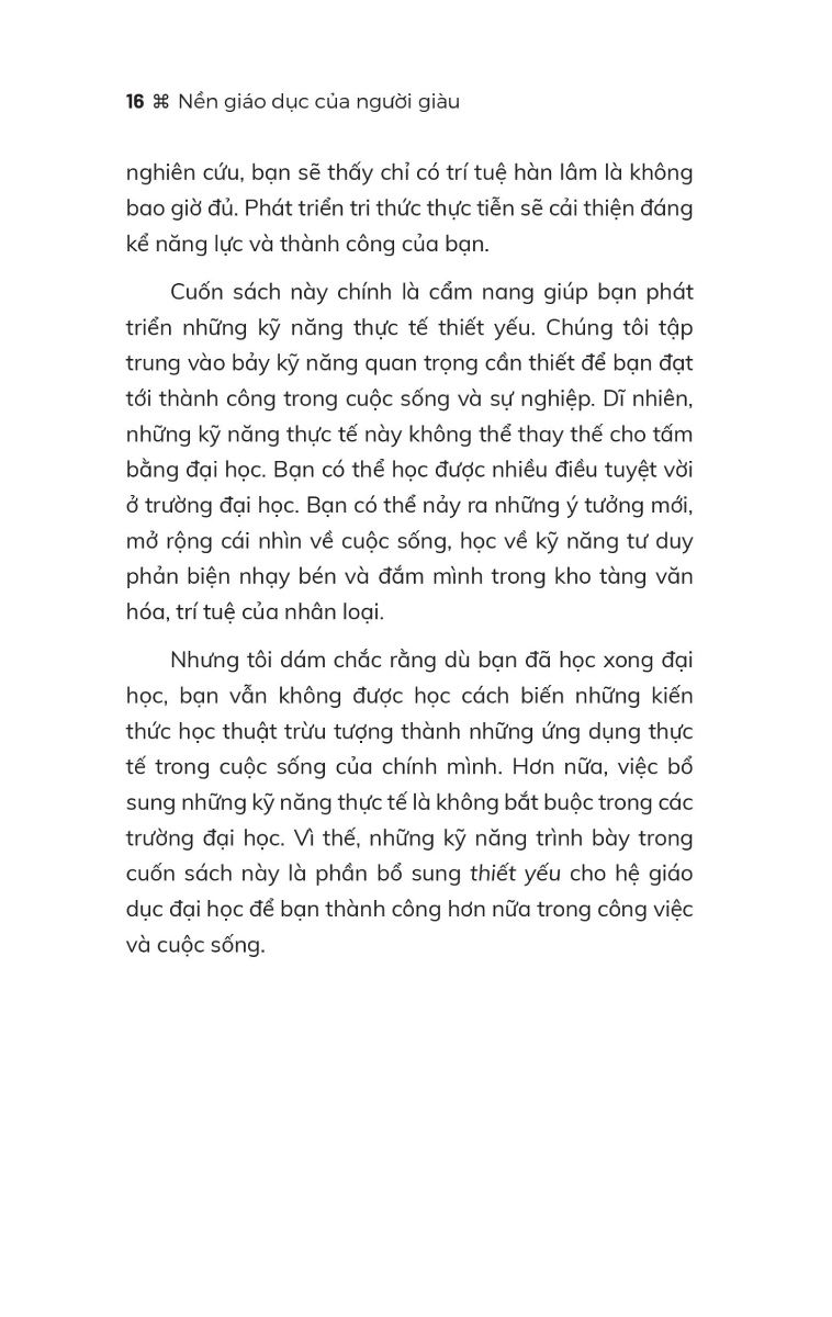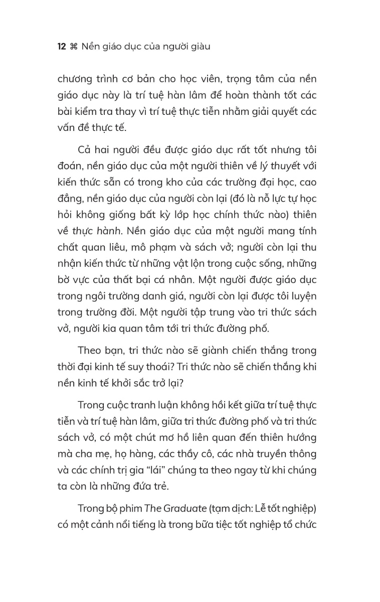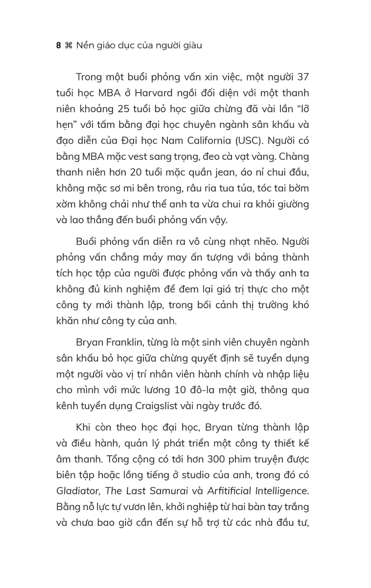 Bạn sẽ thấy được điều đó khi đọc Nền Giáo Dục Của Người Giàu của Michael Ellsberg. Tác giả đã phỏng vấn các tỉ phú và triệu phú không có bằng đại học như ông trùm thời trang Russell Simmons. Bên cạnh đó, Michael Ellsberg còn đưa ra những chỉ dẫn tuyệt vời để bạn tiến tới thành công bằng những kỹ năng vô cùng đơn giản: Để tìm được người hướng dẫn, cách tạo hứng thú trong công việc, cách xây dựng phong cách cá nhân và nhiều hơn thế nữa.