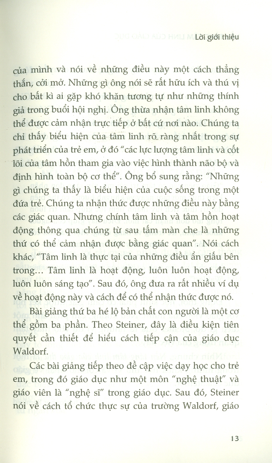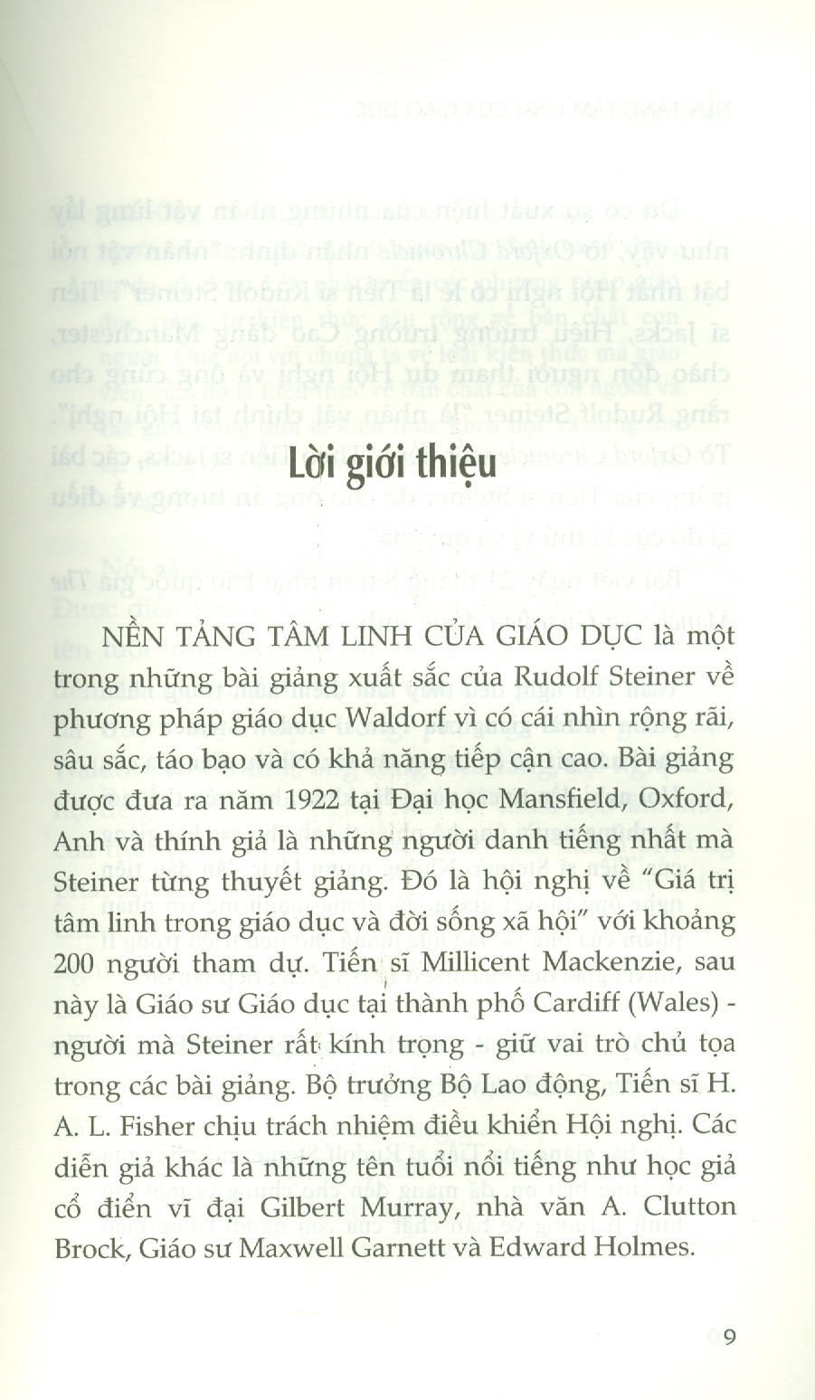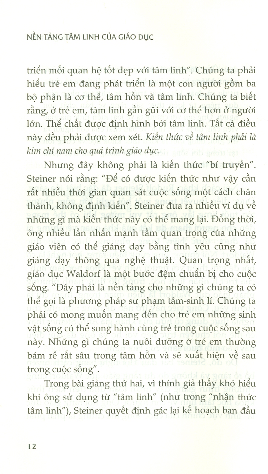 - Tác phẩm Nền tảng tâm linh của giáo dục là một trong những bài giảng xuất sắc của Rudolf Steiner về phương pháp giáo dục Waldorf vì có cái nhìn rộng rãi, sâu sắc, táo bạo và có khả năng tiếp cận cao. Bài giảng được đưa ra năm 1922 tại Đại học Mansfield, Oxford, Anh và thính giả là những người danh tiếng nhất mà Steiner từng thuyết giảng. Đó là hội nghị về “Giá trị tâm linh trong giáo dục và đời sống xã hội” với khoảng 200 người tham dự. Tiến sĩ Millicent Mackenzie, sau này là Giáo sư Giáo dục tại thành phố Cardiff (Wales) - người mà Steiner rất kính trọng - giữ vai trò chủ tọa trong các bài giảng. Bộ trưởng Bộ Lao động, Tiến sĩ H. A. L. Fisher chịu trách nhiệm điều khiển Hội nghị. Các diễn giả khác là những tên tuổi nổi tiếng như học giả cổ điển vĩ đại Gilbert Murray, nhà văn A. Clutton Brock, Giáo sư Maxwell Garnett và Edward Holmes. “Giáo viên cần có tâm trí cởi mở, sẵn sàng đón nhận kiến thức mới mỗi ngày và khuynh hướng có thể biến đổi tri thức tích lũy thành tiềm lực giúp tâm trí luôn rộng mở đón nhận cái mới. Điều này giúp con người khỏe mạnh, trẻ trung và năng động. Một trái tim cởi mở đón nhận những thay đổi trong cuộc sống - sự mới mẻ bất ngờ và tiếp diễn của cuộc sống - phải là bản chất và tâm tính cơ bản của một giáo viên trường Waldorf”.