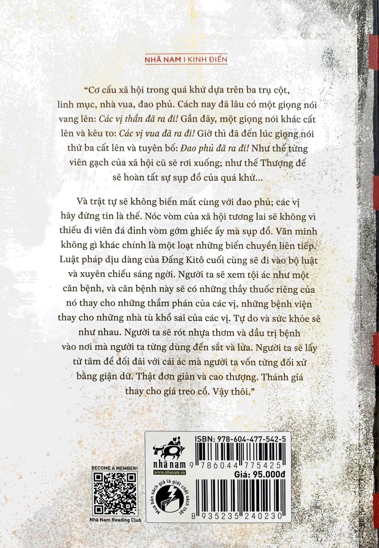 Và trật tự sẽ không biến mất cùng với đao phủ; các vị hãy đừng tin là thế. Nóc vòm của xã hội tương lai sẽ không vì thiếu đi viên đá đỉnh vòm gớm ghiếc ấy mà sụp đổ. Văn minh không gì khác chính là một loạt những biến chuyển liên tiếp. Luật pháp dịu dàng của Đấng Kitô cuối cùng sẽ đi vào bộ luật và xuyên chiếu sáng ngời. Người ta sẽ xem tội ác như một căn bệnh, và căn bệnh này sẽ có những thầy thuốc riêng của nó thay cho những thẩm phán của các vị, những bệnh viện thay cho những nhà tù khổ sai của các vị. Tự do và sức khỏe sẽ như nhau. Người ta sẽ rót nhựa thơm và dầu trị bệnh vào nơi mà người ta từng dùng đến sắt và lửa. Người ta sẽ lấy từ tâm để đối đãi với cái ác mà người ta vốn từng đối xử bằng giận dữ. Thật đơn giản và cao thượng. Thánh giá thay cho giá treo cổ. Vậy thôi.”