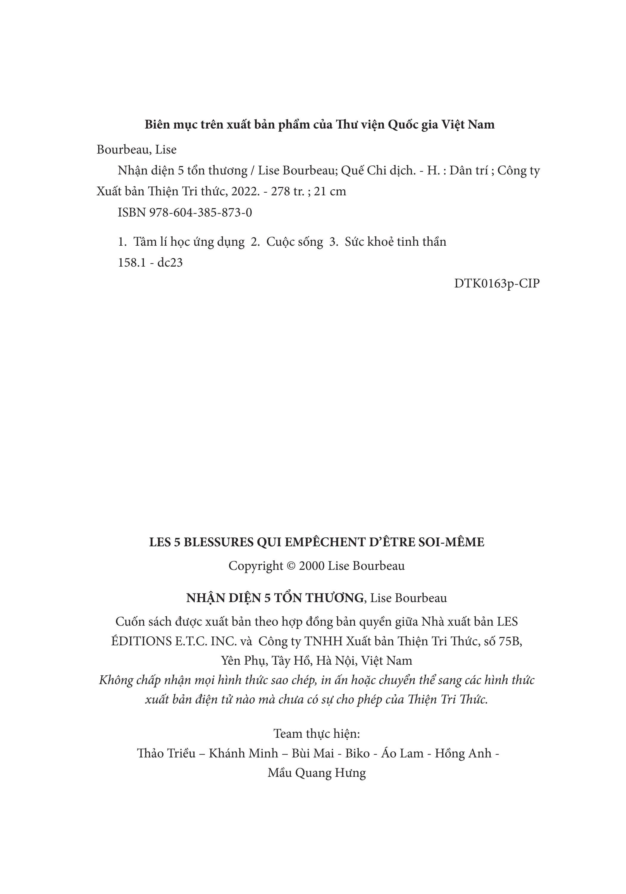 Lise Bourbeau là tác giả nổi tiếng toàn cầu, bà đã viết 20 cuốn sách, trong đó có nhiều đầu sách best-seller về chủ đề lắng nghe cơ thể và nhận diện những tổn thương bên trong. Sách của bà được dịch ra gần 20 ngôn ngữ trên thế giới. Từ khi thành lập trường phái nghiên cứu của m.ình vào năm 1982, những tư tưởng của bà đã giúp đỡ rất nhiều người cải thiện chất lượng cuộc sống và tạo ra những thay đổi bền vững hàng ngày. Lắng nghe cơ thể bạn, trường phái phát triển bản thân có sức ảnh hưởng lớn nhất ở Quebec, đã được truyền bá trong các buổi hội thảo trên hơn 20 quốc gia và trong 10 thứ ngôn ngữ. Bộ sách “Nhận diện 5 tổn thương” và “Chữa lành 5 tổn thương” là hai trong số rất nhiều đầu sách best-seller của bà.