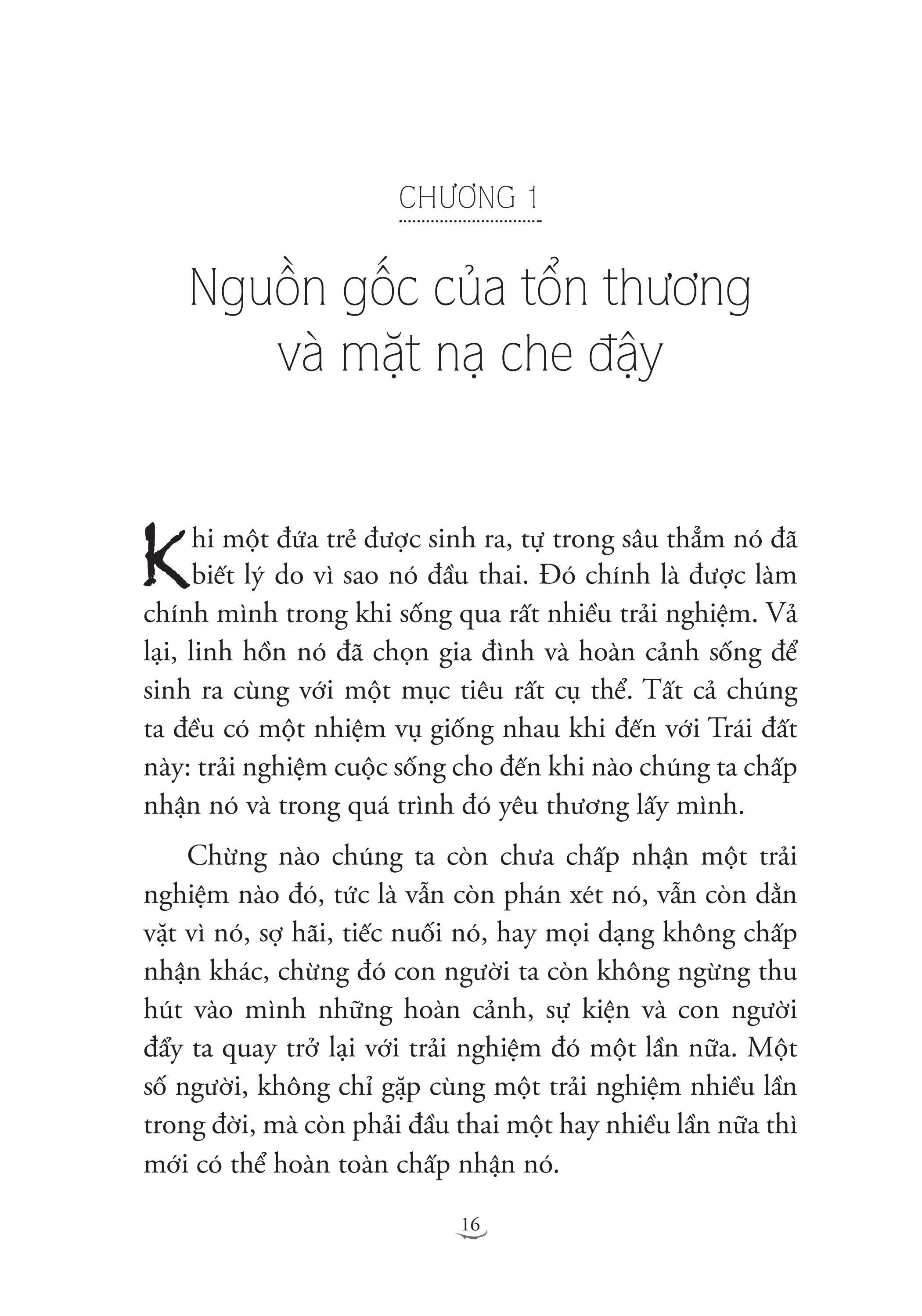 Cuốn sách mô tả những quan sát của tác giả trong hình thể, ngôn ngữ và lời nói của những người đang tái diễn tổn thương (với tổn thương nhục nhã, bị bỏ rơi, bị phủ nhận, bị phản bội, bị đối xử bất công). Nhờ những miêu tả trực giác này của tác giả mà chúng ta có thể phán đoán được một người đang bị ảnh hưởng nhiều bởi chấn thương cảm xúc nào, và việc tự đánh đồng chấn thương cảm xúc đầu đời ấy đã tác động lên cuộc đời họ, cách họ sinh hoạt, nói năng, cách họ đưa ra các lựa chọn của đời m.ình, và rồi được biểu hiện qua cơ thể ra sao. Qua những tổn thương đó, chúng ta thấy được mối quan hệ giữa mặt nạ vô thức ta mang trong quá trình đối phó với những tổn thương và biểu hiện của chúng trên cơ thể ta. Thông qua cuốn sách, chúng ta dần thấu hiểu tâm thức của con người và có thể rút ra được bài học cho chính m.ình trên hành trình “thành nhân” (theo cách nói của Carl Rogers) hay “thành toàn tự ngã” (theo cách nói của Carl Jung) của mỗi chúng ta.