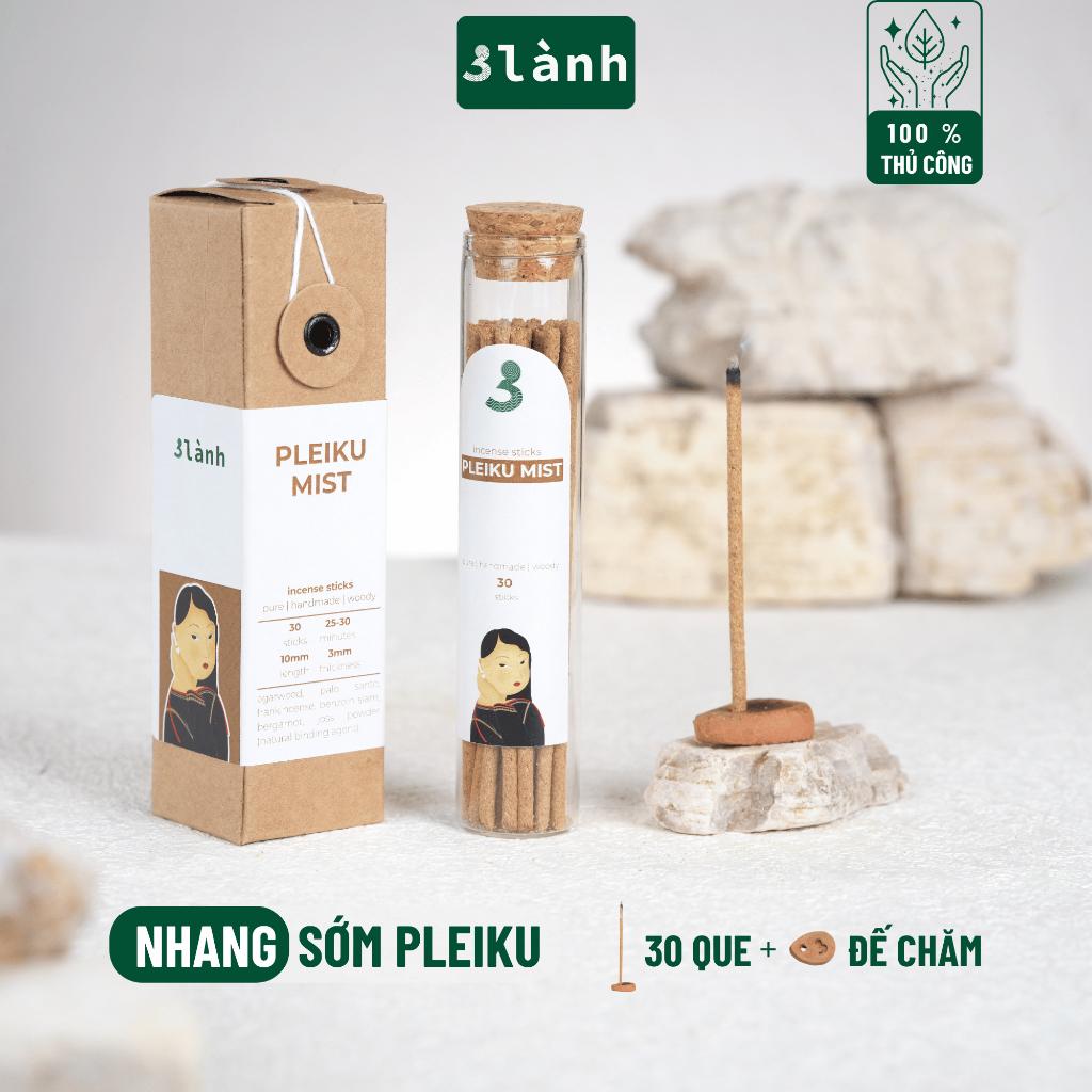 Pleiku Mist (Sớm Pleiku): agarwood (trầm hương), palo santo (gỗ thánh), frankincense (nhũ hương), benzoin siam (an tức hương), bergamot (vỏ cam), keo bời lời. Hương gỗ, ấm sớm mai