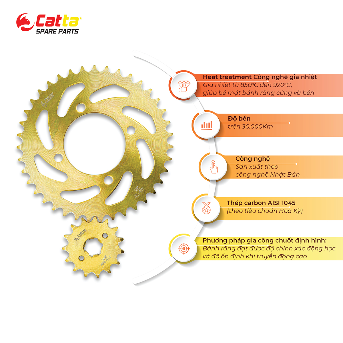 Nhông sên dĩa Exciter (bộ nhông xích Exciter) thương hiệu CATTA Spare Parts được sản xuất từ thép carbon S45C chuyên dụng trong ngành công nghiệp nhông sên dĩa. Do đó, sản phẩm đạt chất lượng cao về độ cứng, độ bền, khả năng chịu tải trọng lớn, đạt tiêu chuẩn quốc tế dành cho các sản phẩm truyền động.